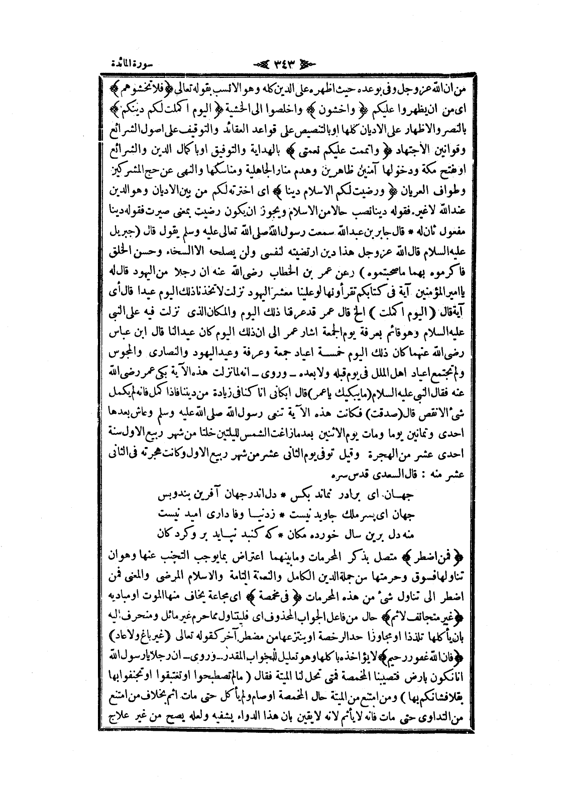 من ان الله عز وجل وفى بوعده حيث أظهره على الدين كله وهو الأنسب بقوله تعالى فَلا تَخْشَوْهُمْ اى من ان يظهروا عليكم وَاخْشَوْنِ وأخلصوا الى الخشية الْيَوْمَ أَكْمَلْتُ لَكُمْ دِينَكُمْ بالنصر والإظهار على الأديان كلها او بالتنصيص على قواعد العقائد والتوقيف على اصول الشرائع وقوانين الاجتهاد وَأَتْمَمْتُ عَلَيْكُمْ نِعْمَتِي بالهداية والتوفيق او بإكمال الدين والشرائع او بفتح مكة ودخولها آمنين ظاهرين وهدم منار الجاهلية ومناسكها والنهى عن حج المشركين وطواف العريان وَرَضِيتُ لَكُمُ الْإِسْلامَ دِيناً اى اخترته لكم من بين الأديان وهو الدين عند الله لا غير. فقوله دينا نصب حالا من الإسلام ويجوز ان يكون رضيت بمعنى صيرت فقوله دينا مفعول ثان له. قال جابر بن عبد الله سمعت رسول الله صلى الله تعالى عليه وسلم يقول قال (جبريل عليه السلام قال الله عز وجل هذا دين ارتضيته لنفسى ولن يصلحه الا السخاء وحسن الخلق فاكرموه بهما ما صحبتموه) وعن عمر بن الخطاب رضى الله عنه ان رجلا من اليهود قال له يا امير المؤمنين آية فى كتابكم تقرءونها لو علينا معشر اليهود نزلت لا تخذنا ذلك اليوم عيدا قال أي آية قال الْيَوْمَ أَكْمَلْتُ إلخ قال عمر قد عرفنا ذلك اليوم والمكان الذي نزلت فيه على النبي عليه السلام وهو قائم بعرفة يوم الجمعة أشار عمر الى ان ذلك اليوم كان عيدا لنا قال ابن عباس رضى الله عنهما كان ذلك اليوم خمسة أعياد جمعة وعرفة وعيد اليهود والنصارى والمجوس ولم تجتمع أعياد اهل الملل فى يوم قبله ولا بعده- وروى- انه لما نزلت هذه الآية بكى عمر رضى الله عنه فقال النبي عليه السلام (ما يبكيك يا عمر) قال أبكاني انا كنا فى زيادة من ديننا فاذا كمل فانه لم يكمل شىء الأنقص قال (صدقت) فكانت هذه الآية تنعى رسول الله صلى الله عليه وسلم وعاش بعدها احدى وثمانين يوما ومات يوم الاثنين بعد ما زاغت الشمس لليلتين خلتا من شهر ربيع الاول سنة احدى عشر من الهجرة. وقيل توفى يوم الثاني عشر من شهر ربيع الاول وكانت هجرته فى الثاني عشر منه: قال السعدي قدس سره