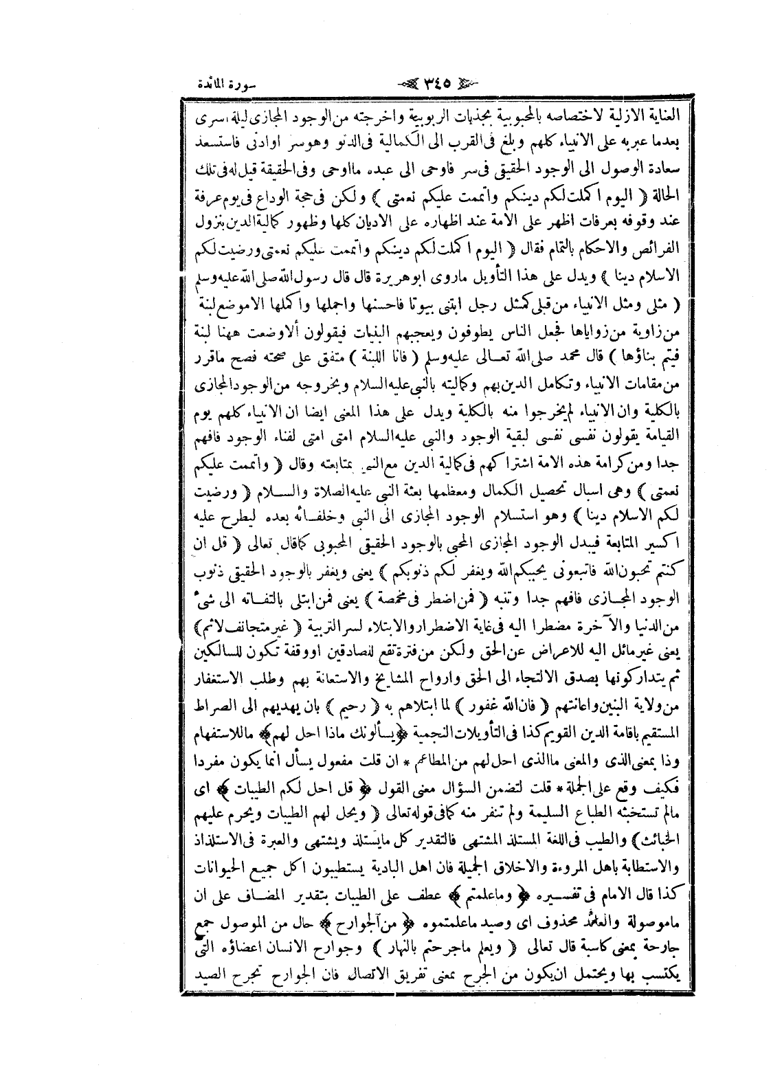 العناية الازلية لاختصاصه بالمحبوبية بجذبات الربوبية وأخرجته من الوجود المجازى ليلة اسرى بعد ما عبر به على الأنبياء كلهم وبلغ فى القرب الى الكمالية فى الدنو وهو سر او ادنى فاستسعد سعادة الوصول الى الوجود الحقيقي فى سر فاوحى الى عبده ما اوحى وفى الحقيقة قيل له فى تلك الحالة الْيَوْمَ أَكْمَلْتُ لَكُمْ دِينَكُمْ وَأَتْمَمْتُ عَلَيْكُمْ نِعْمَتِي ولكن فى حجة الوداع فى يوم عرفة عند وقوفه بعرفات اظهر على الامة عند إظهاره على الأديان كلها وظهور كمالية الدين بنزول الفرائض والاحكام بالتمام فقال الْيَوْمَ أَكْمَلْتُ لَكُمْ دِينَكُمْ وَأَتْمَمْتُ عَلَيْكُمْ نِعْمَتِي وَرَضِيتُ لَكُمُ الْإِسْلامَ دِيناً ويدل على هذا التأويل ما روى ابو هريرة قال قال رسول الله صلى الله عليه وسلم (مثلى ومثل الأنبياء من قبلى كمثل رجل ابتنى بيوتا فاحسنها وأجملها وأكملها الا موضع لبنة من زاوية من زواياها فجعل الناس يطوفون ويعجبهم البنيات فيقولون ألا وضعت هاهنا لبنة فيتم بناؤها) قال محمد صلى الله تعالى عليه وسلم (فانا اللبنة) متفق على صحته فصح ما قرر من مقامات الأنبياء وتكامل الدين بهم وكماليته بالنبي عليه السلام وبخروجه من الوجود المجازى بالكلية وان الأنبياء لم يخرجوا منه بالكلية ويدل على هذا المعنى ايضا ان الأنبياء كلهم يوم القيامة يقولون نفسى نفسى لبقية الوجود والنبي عليه السلام أمتي أمتي لفناء الوجود فافهم جدا ومن كرامة هذه الامة اشتراكهم فى كمالية الدين مع النبي بمتابعته وقال وَأَتْمَمْتُ عَلَيْكُمْ نِعْمَتِي وهى اسبال تحصيل الكمال ومعظمها بعثة النبي عليه الصلاة والسلام وَرَضِيتُ لَكُمُ الْإِسْلامَ دِيناً وهو استسلام الوجود المجازى الى النبي وخلفائه بعده ليطرح عليه اكسير المتابعة فيبدل الوجود المجازى المحبى بالوجود الحقيقي المحبوبى كما قال تعالى قُلْ إِنْ كُنْتُمْ تُحِبُّونَ اللَّهَ فَاتَّبِعُونِي يُحْبِبْكُمُ اللَّهُ وَيَغْفِرْ لَكُمْ ذُنُوبَكُمْ يعنى ويغفر بالوجود الحقيقي ذنوب الوجود المجازى فافهم جدا وتنبه فَمَنِ اضْطُرَّ فِي مَخْمَصَةٍ يعنى فمن ابتلى بالتفاته الى شىء من الدنيا والآخرة مضطرا اليه فى غاية الاضطرار والابتلاء لسر التربية غَيْرَ مُتَجانِفٍ لِإِثْمٍ يعنى غير مائل اليه للاعراض عن الحق ولكن من فترة تقع للصادقين او وقفة تكون للسالكين ثم يتداركونها بصدق الالتجاء الى الحق وأرواح المشايخ والاستعانة بهم وطلب الاستغفار من ولاية البنين واعانتهم فَإِنَّ اللَّهَ غَفُورٌ لما ابتلاهم به رَحِيمٌ بان يهديهم الى الصراط المستقيم باقامة الدين القويم كذا فى التأويلات النجمية يَسْئَلُونَكَ ماذا أُحِلَّ لَهُمْ ما للاستفهام وذا بمعنى الذي والمعنى ما الذي أحل لهم من المطاعم. ان قلت مفعول يسأل انما يكون مفردا فكيف وقع على الجملة. قلت لتضمن السؤال معنى القول قُلْ أُحِلَّ لَكُمُ الطَّيِّباتُ اى ما لم تستخبثه الطباع السليمة ولم تنفر منه كما فى قوله تعالى وَيُحِلُّ لَهُمُ الطَّيِّباتِ وَيُحَرِّمُ عَلَيْهِمُ الْخَبائِثَ والطيب فى اللغة المستلذ المشتهى فالتقدير كل ما يستلذ ويشتهى والعبرة فى الاستلذاذ والاستطابة باهل المروءة والأخلاق الجميلة فان اهل البادية يستطيبون أكل جميع الحيوانات كذا قال الامام فى تفسيره وَما عَلَّمْتُمْ عطف على الطيبات بتقدير المضاف على ان ما موصولة والعائد محذوف اى وصيد ما علمتموه مِنَ الْجَوارِحِ حال من الموصول جمع جارحة بمعنى كاسبة قال تعالى وَيَعْلَمُ ما جَرَحْتُمْ بِالنَّهارِ وجوارح الإنسان أعضاؤه التي يكتسب بها ويحتمل ان يكون من الجرح بمعنى تفريق الاتصال فان الجوارح تجرح الصيد
