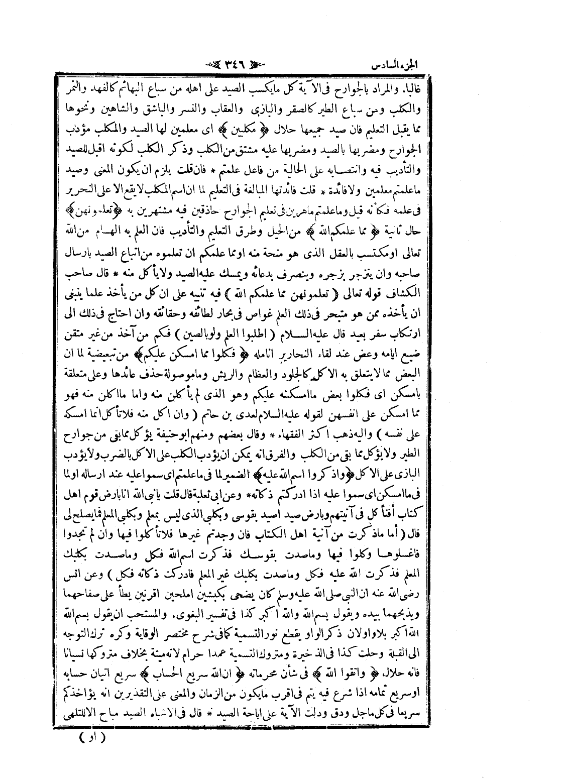 وان ينزجر بزجره وينصرف بدعائه ويمسك عليه الصيد ولا يأكل منه. قال صاحب الكشاف قوله تعالى تُعَلِّمُونَهُنَّ مِمَّا عَلَّمَكُمُ اللَّهُ فيه تنبيه على ان كل من يأخذ علما ينبغى ان يأخذه ممن هو متبحر فى ذلك العلم غواص فى بحار لطائفه وحقائقه وان احتاج فى ذلك الى ارتكاب سفر بعيد قال عليه السلام (اطلبوا العلم ولو بالصين) فكم من آخذ من غير متقن ضيع أيامه وعض عند لقاء النحارير أنامله فَكُلُوا مِمَّا أَمْسَكْنَ عَلَيْكُمْ من تبعيضية لما ان البعض مما لا يتعلق به الاكل كالجلود والعظام والريش وما موصولة حذف عائدها وعلى متعلقة بامسكن اى فكلوا بعض ما امسكنه عليكم وهو الذي لم يأكلن منه واما ما أكلن منه فهو مما أمسكن على انفسهن لقوله عليه السلام لعدى بن حاتم (وان أكل منه فلا تأكل انما امسكه على نفسه) واليه ذهب اكثر الفقهاء. وقال بعضهم ومنهم ابو حنيفة يؤكل مما بقي من جوارح الطير ولا يؤكل مما بقي من الكلب والفرق انه يمكن ان يؤدب الكلب على الاكل بالضرب ولا يؤدب البازي على الاكل وَاذْكُرُوا اسْمَ اللَّهِ عَلَيْهِ الضمير لما فى ما علمتم اى سموا عليه عند إرساله او لما فى ما أمسكن اى سموا عليه إذا أدركتم ذكاته. وعن ابى ثعلبة قال قلت يا نبى الله انا بأرض قوم اهل كتاب أفنأكل فى آنيتهم وبأرض صيد اصيد بقوسي وبكلبى الذي ليس بمعلم وبكلبى المعلم فما يصلح لى قال (أما ما ذكرت من آنية اهل الكتاب فان وجدتم غيرها فلا تأكلوا فيها وان لم تجدوا فاغسلوها وكلوا فيها وما صدت بقوسك فذكرت اسم الله فكل وما صدت بكلبك المعلم فذكرت الله عليه فكل وما صدت بكلبك غير المعلم فادركت ذكاته فكل) وعن انس رضى الله عنه ان النبي صلى الله عليه وسلم كان يضحى بكبشين أملحين أقرنين يطأ على صفاحهما ويذبحهما بيده ويقول بسم الله والله اكبر كذا فى تفسير البغوي. والمستحب ان يقول بسم الله الله اكبر بلا واو لان ذكر الواو يقطع نور التسمية كما فى شرح مختصر الوقاية وكره ترك التوجه الى القبلة وحلت كذا فى الذخيرة ومتروك التسمية عمدا حرام لانه ميتة بخلاف متروكها نسيانا فانه حلال وَاتَّقُوا اللَّهَ فى شأن محرماته إِنَّ اللَّهَ سَرِيعُ الْحِسابِ سريع إتيان حسابه او سريع تمامه إذا شرع فيه يتم فى اقرب ما يكون من الزمان والمعنى على التقديرين انه يؤاخذكم سريعا فى كل ما جل ودق ودلت الآية على اباحة الصيد. قال فى الأشباه الصيد مباح إلا للتلهي