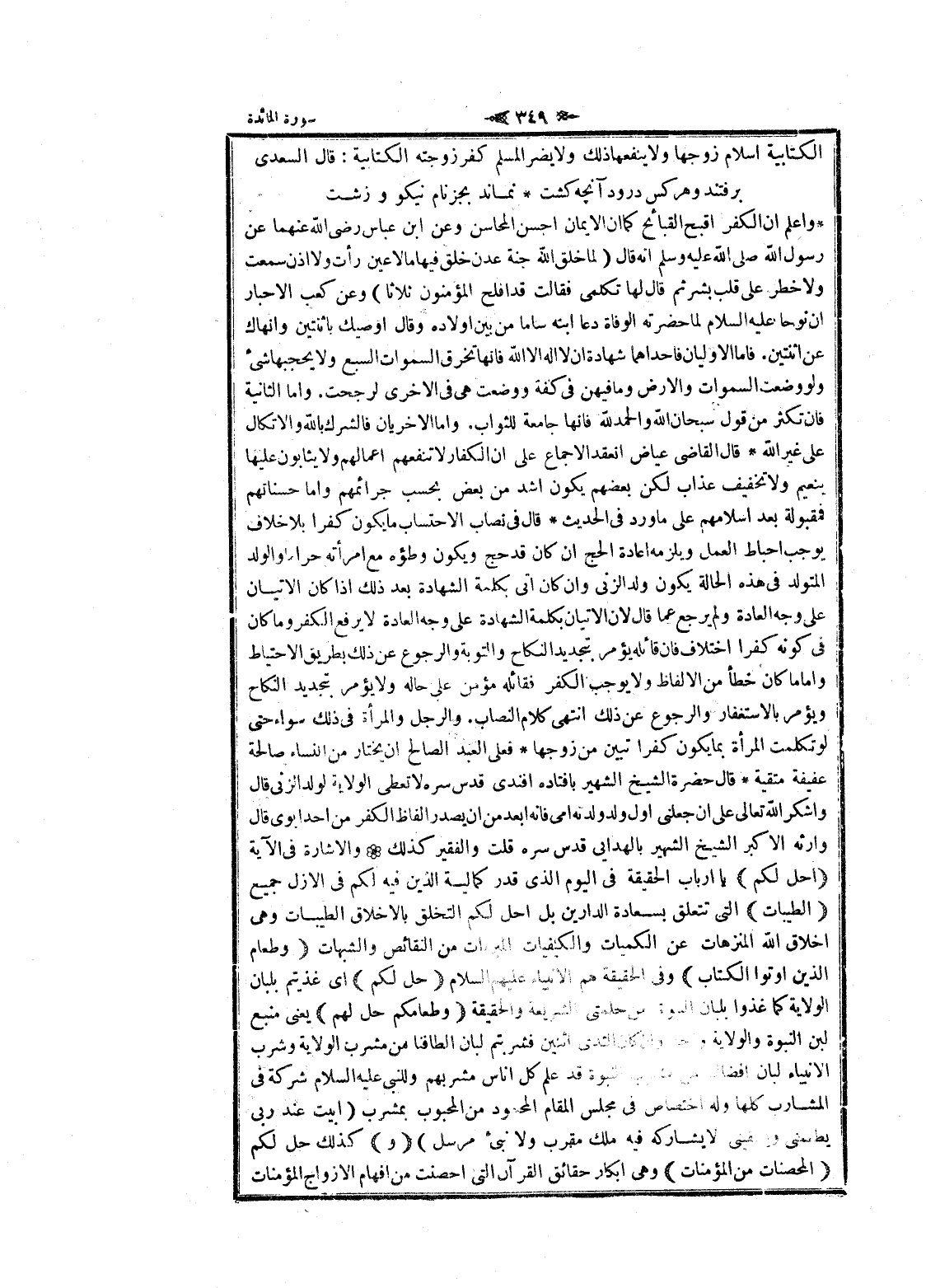 لان الإتيان بكلمة الشهادة على وجه العادة لا يرفع الكفر وما كان فى كونه كفرا اختلاف فان قائله يؤمر بتجديد النكاح والتوبة والرجوع عن ذلك بطريق الاحتياط واما ما كان خطأ من الألفاظ ولا يوجب الكفر فقائله مؤمن على حاله ولا يؤمر بتجديد النكاح ويؤمر بالاستغفار والرجوع عن ذلك انتهى كلام النصاب. والرجل والمرأة فى ذلك سواء حتى لو تكلمت المرأة بما يكون كفرا تبين من زوجها. فعلى العبد الصالح ان يختار من النساء صالحة عفيفة متقية. قال حضرة الشيخ الشهير بافتاده افندى قدس سره لا تعطى الولاية لولد الزنى قال واشكر الله تعالى على ان جعلنى أول ولد ولدته أمي فانه ابعد من ان يصدر ألفاظ الكفر من أحد أبوي قال وارثه الأكبر الشيخ الشهير بالهدائي قدس سره قلت والفقير كذلك. والاشارة فى الآية أُحِلَّ لَكُمُ يا ارباب الحقيقة فى اليوم الذي قدر كمالية الدين فيه لكم فى الأزل جميع الطَّيِّباتُ التي تتعلق بسعادة الدارين بل أحل لكم التخلق بالأخلاق الطيبات وهى اخلاق الله المنزهات عن الكميات والكيفيات المبرءات من النقائص والشبهات وَطَعامُ الَّذِينَ أُوتُوا الْكِتابَ وفى الحقيقة هم الأنبياء عليهم السلام حِلٌّ لَكُمْ اى غذيتم بلبان الولاية كما غذوا بلبان النبوة من حلمتى الشريعة والحقيقة وَطَعامُكُمْ حِلٌّ لَهُمْ يعنى منبع لبن النبوة والولاية واحد وان كان الثدي اثنين فشربتم لبان الطافنا من مشرب الولاية وشرب الأنبياء لبان افضالنا من مشرب النبوة قد علم كل أناس مشربهم وللنبى عليه السلام شركة فى المشارب كلها وله اختصاص فى مجلس المقام المحمود من المحبوب بمشرب (أبيت عند ربى يطعمنى ويسقينى لا يشاركه فيه ملك مقرب ولا نبىء مرسل) وَكذلك حل لكم الْمُحْصَناتُ مِنَ الْمُؤْمِناتِ وهى أبكار حقائق القرآن التي أحصنت من إفهام الأزواج المؤمنات