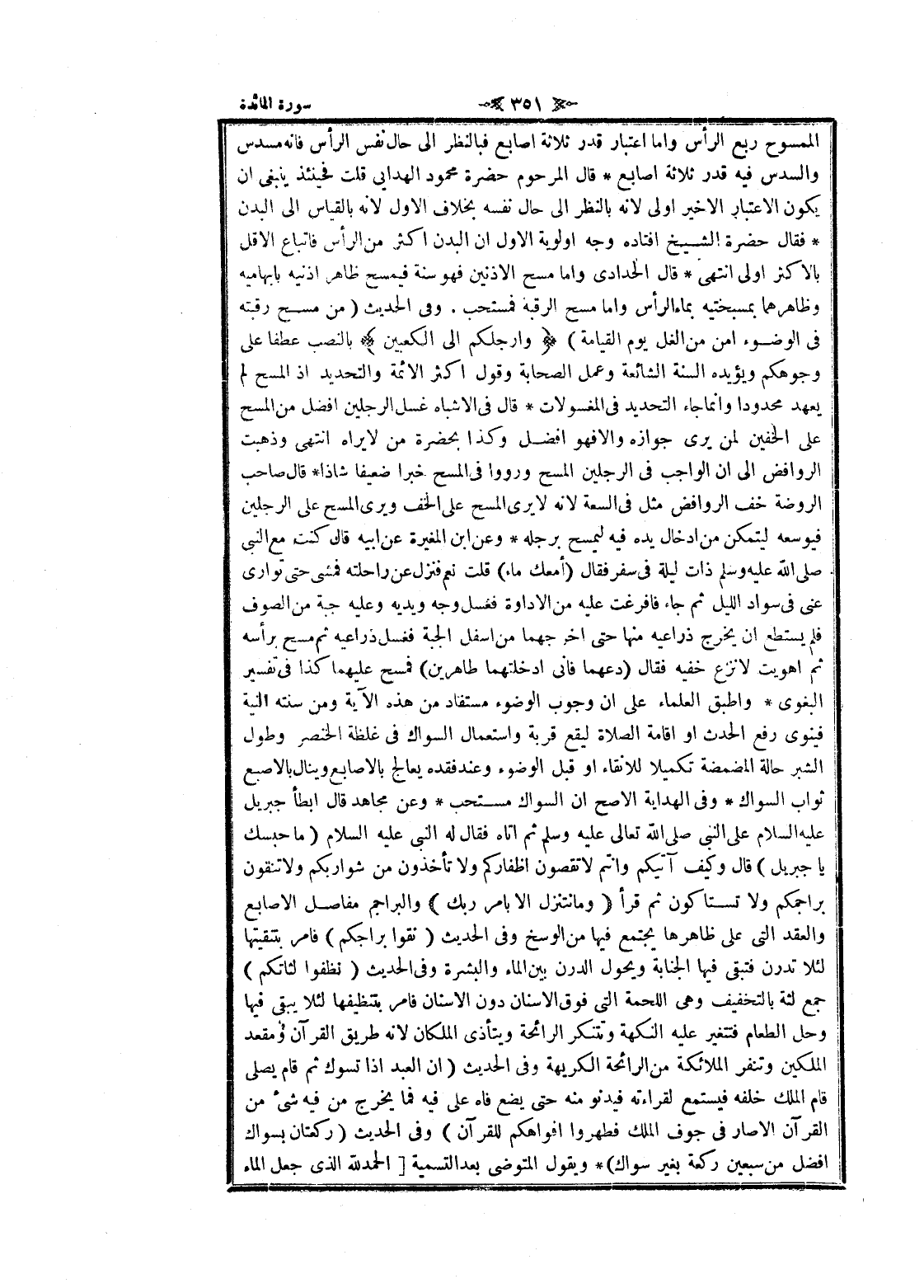 الممسوح ربع الرأس واما اعتبار قدر ثلاثة أصابع فبالنظر الى حال نفس الرأس فانه مسدس والسدس فيه قدر ثلاثة أصابع. قال المرحوم حضرة محمود الهدايى قلت فحينئذ ينبغى ان يكون الاعتبار الأخير اولى لانه بالنظر الى حال نفسه بخلاف الاول لانه بالقياس الى البدن.