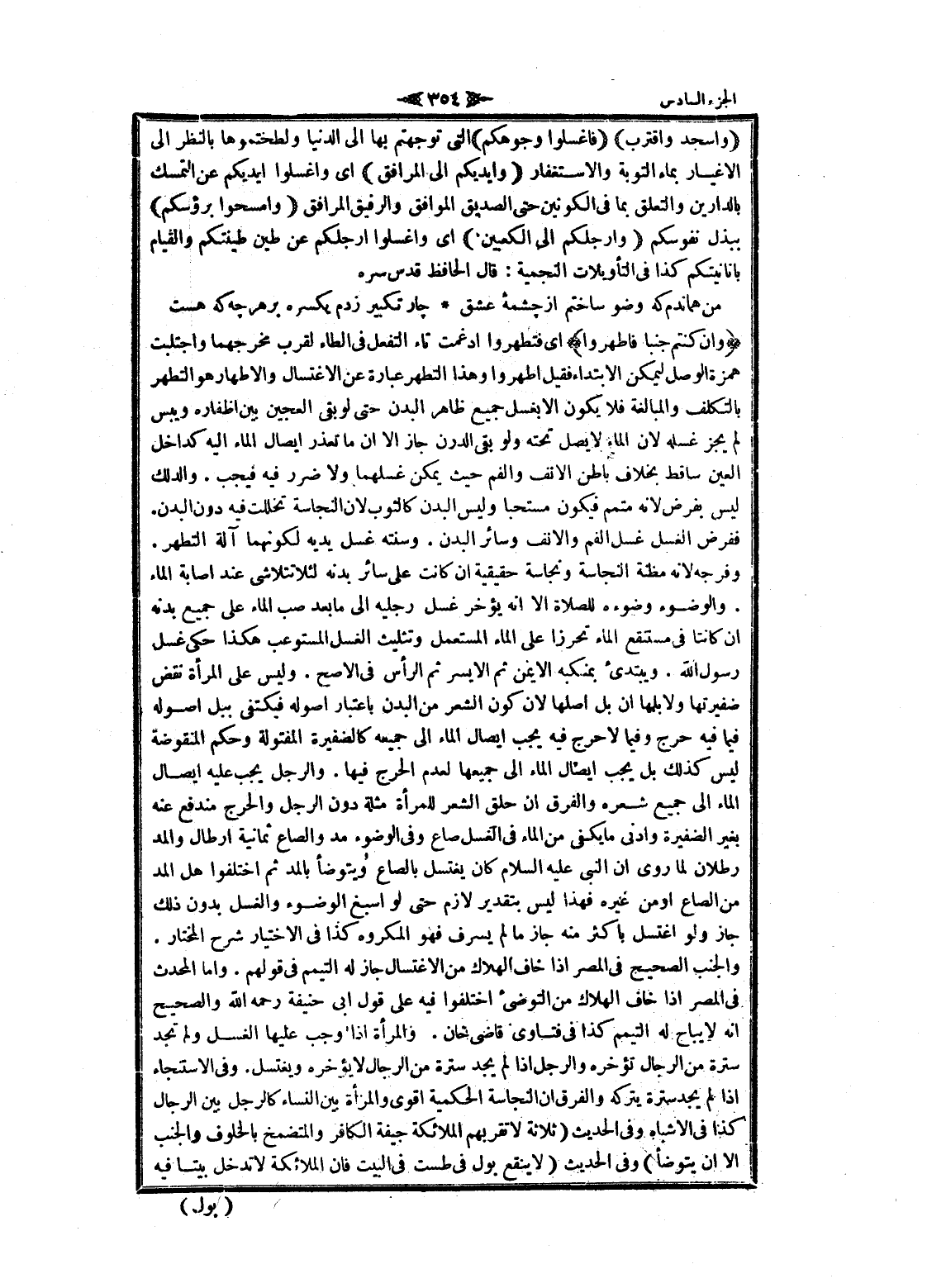 وَإِنْ كُنْتُمْ جُنُباً فَاطَّهَّرُوا اى فتطهروا أدغمت تاء التفعل فى الطاء لقرب مخرجهما واجتلبت همزة الوصل ليمكن الابتداء فقيل اطهروا وهذا التطهر عبارة عن الاغتسال والاطهار هو التطهر بالتكلف والمبالغة فلا يكون الا بغسل جميع ظاهر البدن حتى لو بقي العجين بين أظفاره ويبس لم يجز غسله لان الماء لا يصل تحته ولو بقي الدرن جاز الا ان ما تعذر إيصال الماء اليه كداخل العين ساقط بخلاف باطن الانف والفم حيث يمكن غسلهما ولا ضرر فيه فيجب. والدلك ليس بفرض لانه متمم فيكون مستحبا وليس البدن كالثوب لان النجاسة تخللت فيه دون البدن.
