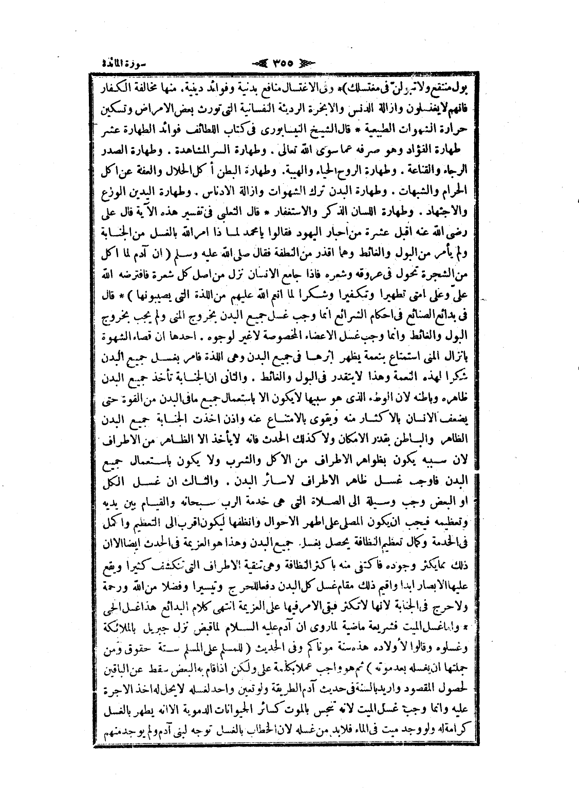 بول منتقع ولا تبولنّ فى مغتسلك) وفى الاغتسال منافع بدنية وفوائد دينية. منها مخالفة الكفار فانهم لا يغتسلون وازالة الدنس والابخرة الرديئة النفسانية التي تورث بعض الأمراض وتسكين حرارة الشهوات الطبيعية. قال الشيخ النيسابورى فى كتاب اللطائف فوائد الطهارة عشر طهارة الفؤاد وهو صرفه عما سوى الله تعالى. وطهارة السر المشاهدة. وطهارة الصدر الرجاء والقناعة. وطهارة الروح الحياء والهيبة. وطهارة البطن أكل الحلال والعفة عن أكل الحرام والشبهات. وطهارة البدن ترك الشهوات وازالة الأدناس. وطهارة اليدين الورع والاجتهاد. وطهارة اللسان الذكر والاستغفار. قال الثعلبي فى تفسير هذه الآية قال على رضى الله عنه اقبل عشرة من أحبار اليهود فقالوا يا محمد لماذا امر الله بالغسل من الجنابة ولم يأمر من البول والغائط وهما أقذر من النطفة فقال صلى الله عليه وسلم (ان آدم لما أكل من الشجرة تحول فى عروقه وشعره فاذا جامع الإنسان نزل من اصل كل شعرة فافترضه الله علىّ وعلى أمتي تطهيرا وتكفيرا وشكرا لما أنعم الله عليهم من اللذة التي يصيبونها) قال فى بدائع الصنائع فى احكام الشرائع انما وجب غسل جميع البدن بخروج المنى ولم يجب بخروج البول والغائط وانما وجب غسل الأعضاء المخصوصة لا غير لوجوه. أحدها ان قضاء الشهوة بانزال المنى استمتاع بنعمة يظهر اثرها فى جميع البدن وهى اللذة فامر بغسل جميع البدن شكرا لهذه النعمة وهذا لا يتقدر فى البول والغائط. والثاني ان الجنابة تأخذ جميع البدن ظاهره وباطنه لان الوطء الذي هو سببها لا يكون الا باستعمال جميع ما فى البدن من القوة حتى يضعف الإنسان بالإكثار منه ويقوى بالامتناع عنه واذن أخذت الجنابة جميع البدن الظاهر والباطن بقدر الإمكان ولا كذلك الحدث فانه لا يأخذ الا الظاهر من الأطراف لان سببه يكون بظواهر الأطراف من الاكل والشرب ولا يكون باستعمال جميع البدن فاوجب غسل ظاهر الأطراف لا سائر البدن. والثالث ان غسل الكل او البعض وجب وسيلة الى الصلاة التي هى خدمة الرب سبحانه والقيام بين يديه وتعظيمه فيجب ان يكون المصلى على اطهر الأحوال وانظفها ليكون اقرب الى التعظيم وأكمل فى الخدمة وكمال تعظيم النظافة يحصل بغسل جميع البدن وهذا هو العزيمة فى الحدث ايضا الا ان ذلك مما يكثر وجوده فاكتفى منه بأكثر النظافة وهى تنقية الأطراف التي تنكشف كثيرا ويقع عليها الابصار ابدا وأقيم ذلك مقام غسل كل البدن دفعا للحرج وتيسيرا وفضلا من الله ورحمة ولا حرج فى الجنابة لانها لا تكثر فبقى الأمر فيها على العزيمة انتهى كلام البدائع هذا غسل الحي.
