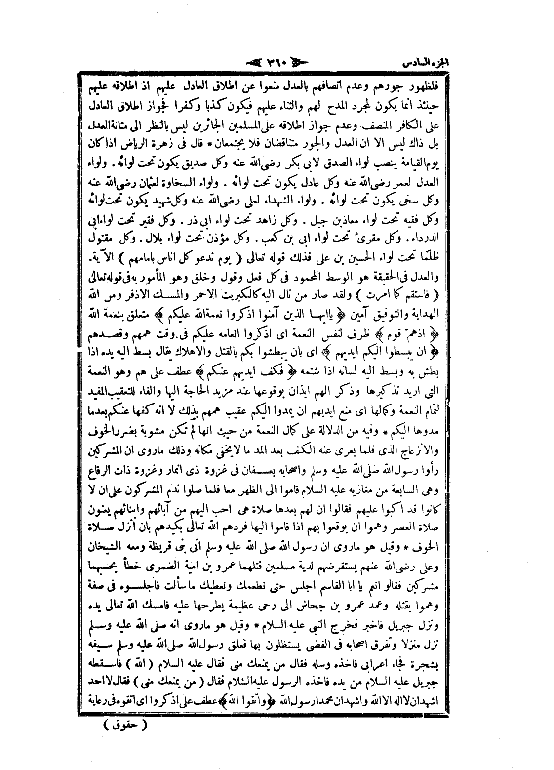 فلظهور جورهم وعدم اتصافهم بالعدل منعوا عن اطلاق العادل عليهم إذ إطلاقه عليهم حينئذ انما يكون لمجرد المدح لهم والثناء عليهم فيكون كذبا وكفرا فجواز اطلاق العادل على الكافر المنصف وعدم جواز إطلاقه على المسلمين الجائرين ليس بالنظر الى متانة العدل بل ذاك ليس الا ان العدل والجور متناقضان فلا يجتمعان. قال فى زهرة الرياض إذا كان يوم القيامة ينصب لواء الصدق لابى بكر رضى الله عنه وكل صديق يكون تحت لوائه. ولواء العدل لعمر رضى الله عنه وكل عادل يكون تحت لوائه. ولواء السخاوة لعثمان رضى الله عنه وكل سخى يكون تحت لوائه. ولواء الشهداء لعلى رضى الله عنه وكل شهيد يكون تحت لوائه وكل فقيه تحت لواء معاذ بن جبل. وكل زاهد تحت لواء ابى ذر. وكل فقير تحت لواء ابى الدرداء. وكل مقرئ تحت لواء ابى بن كعب. وكل مؤذن تحت لواء بلال. وكل مقتول ظلما تحت لواء الحسين بن على فذلك قوله تعالى يَوْمَ نَدْعُوا كُلَّ أُناسٍ بِإِمامِهِمْ الآية.