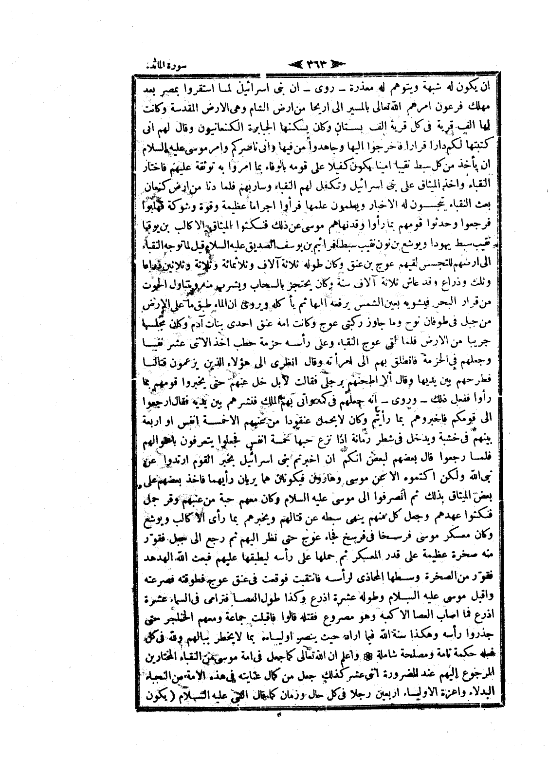 فرسخ فجاء عوج حتى نظر إليهم ثم رجع الى جبل فقوّر منه صخرة عظيمة على قدر المعسكر ثم حملها على رأسه ليطبقها عليهم فبعث الله الهدهد فقوّر من الصخرة وسطها المحاذي لرأسه فانتقبت فوقعت فى عنق عوج فطوقته فصرعته واقبل موسى عليه السلام وطوله عشرة اذرع وكذا طول العصا فترامى فى السماء عشرة اذرع فما أصاب العصا الا كعبه وهو مصروع فقتله قالوا فاقبلت جماعة ومعهم الخناجر حتى جذروا رأسه وهكذا سنة الله فيما أراد حيث ينصر أولياءه بما لا يخطر ببالهم ولله فى كل فعله حكمة تامة ومصلحة شاملة. واعلم ان الله تعالى كما جعل فى امة موسى من النقباء المختارين المرجوع إليهم عند الضرورة اثنى عشر كذلك جعل من كمال عنايته فى هذه الامة من النجباء البدلاء واعزة الأولياء أربعين رجلا فى كل حال وزمان كما قال النبي عليه السلام (يكون