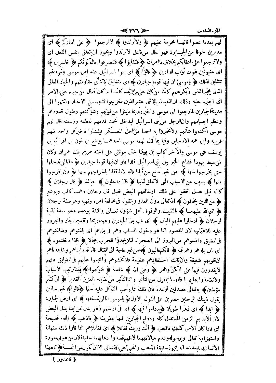 لهم بعد ما عصوا فانها محرمة عليهم وَلا تَرْتَدُّوا لا ترجعوا عَلى أَدْبارِكُمْ اى مدبرين خوفا من الجبابرة فهو حال من فاعل لا ترتدوا ويجوز ان يتعلق بنفس الفعل اى ولا ترجعوا على أعقابكم بخلاف ما امر الله فَتَنْقَلِبُوا فتنصرفوا حال كونكم خاسِرِينَ اى مغبونين بفوت ثواب الدارين قالُوا اى بنوا إسرائيل عند امر موسى ونهيه غير ممتثلين لذلك يا مُوسى إِنَّ فِيها قَوْماً جَبَّارِينَ اى متغلبين لا تتأتى مقاومتهم والجبار العالي الذي يجبر الناس ويكرههم كائنا من كان على ما يريده كائنا ما كان فعال من جبره على الأمر اى أجبره عليه وذلك ان النقباء الاثني عشر الذين خرجوا لتجسس الاخبار وانتهوا الى مدينة الجبارين لما رجعوا الى موسى واخبروه بما عاينوا من قوتهم وشوكتهم وطول قدودهم وعظم أجسامهم وان الرجل من بنى إسرائيل ليدخل تحت قدمهم لعظمه ووسعته قال لهم موسى اكتموا شأنهم ولا تخبروا به أحدا من اهل المعسكر فيفشلوا فاخبر كل واحد منهم قريبه وابن عمه إلا رجلين وفيا بما قال لهما موسى أحدهما يوشع بن نون بن افرائيم بن يوسف فتى موسى والآخر كالب بن يوفنا ختن موسى على أخته مريم بنت عمران وكان من سبط يهودا فشاع الخبر بين بنى إسرائيل فلذا قالو ان فيها قوما جبارين وَإِنَّا لَنْ نَدْخُلَها حَتَّى يَخْرُجُوا مِنْها من غير صنع من قبلنا فانه لا طاقة لنا بإخراجهم منها فَإِنْ يَخْرُجُوا مِنْها بسبب من الأسباب التي لا تعلق لنا بها فَإِنَّا داخِلُونَ حينئذ قالَ رَجُلانِ كانه قيل هل اتفقوا على ذلك او خالفهم البعض فقيل قال رجلان وهما كالب ويوشع مِنَ الَّذِينَ يَخافُونَ الله تعالى دون العدو ويتقونه فى مخالفة امره ونهيه وهو صفة لرجلان أَنْعَمَ اللَّهُ عَلَيْهِمَا بالتثبيت والوقوف على شؤونه تعالى والثقة بوعده وهو صفة ثانية لرجلان ادْخُلُوا عَلَيْهِمُ الْبابَ اى باب بلد الجبارين وهو أريحا وتقديم الجار والمجرور عليه للاهتمام به لان المقصود انما هو دخول الباب وهم فى بلدهم اى باغتوهم وضاغتوهم فى المضيق وامنعوهم من البروز الى الصحراء لئلا يجدوا للحرب مجالا فَإِذا دَخَلْتُمُوهُ اى باب بلدهم وهم فيه فَإِنَّكُمْ غالِبُونَ من غير حاجة الى القتال فانا قد رأيناهم وشاهدناهم ان قلوبهم ضعيفة وان كانت أجسادهم عظيمة فلا تخشوهم واهجموا عليهم فى المضايق فانهم لا يقدرون فيها على الكر والفر وَعَلَى اللَّهِ خاصة فَتَوَكَّلُوا بعد ترتيب الأسباب ولا تعتمدوا عليها فانها بمعزل من التأثير وانما التأثير من عنايته العزيز القدير إِنْ كُنْتُمْ مُؤْمِنِينَ به تعالى مصدقين لوعده فان ذلك مما يوجب التوكل عليه حتما قالُوا غير مبالين بقول ذينك الرجلين مصرين على القول الاول يا مُوسى إِنَّا لَنْ نَدْخُلَها اى ارض الجبابرة أَبَداً اى دهرا طويلا ما دامُوا فِيها اى فى ارضهم وهو بدل من ابدا بدل البعض لان الابد يعم الزمن المستقبل كله ودوام الجبارين فيها بعض منه فَاذْهَبْ الفاء فصيحة اى فاذا كان الأمر كذلك فاذهب أَنْتَ وَرَبُّكَ فَقاتِلا اى فقاتلاهم انما قالوا ذلك استهانة واستهزاء به تعالى وبرسوله وعدم مبالاة بهما لا انهم قصدوا ذهابهما حقيقة لان من هو فى صورة الإنسان يستبعد منه انه يجوز حقيقة الذهاب والمجيء على الله تعالى الا ان يكون من المجسمة إِنَّا هاهُنا قاعِدُونَ