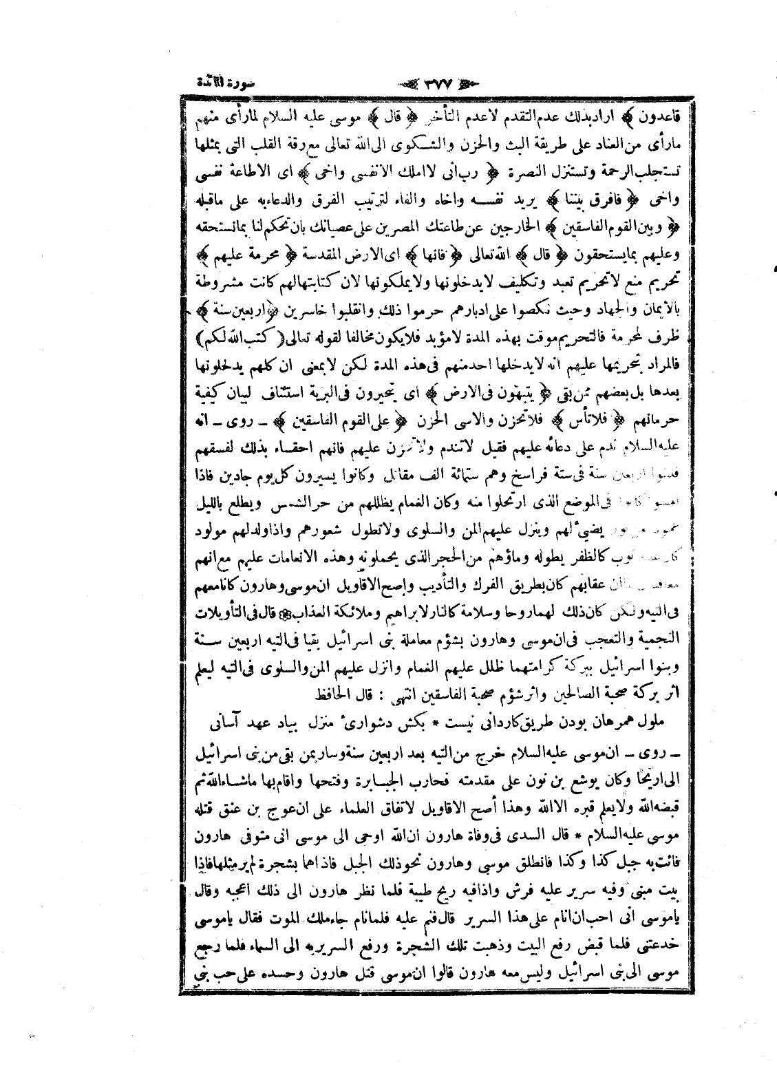 - روى- ان موسى عليه السلام خرج من التيه بعد أربعين سنة وسار بمن بقي من بنى إسرائيل الى أريحا وكان يوشع بن نون على مقدمته فحارب الجبابرة وفتحها واقام بها ما شاء الله ثم قبضه الله ولا يعلم قبره الا الله وهذا أصح الأقاويل لاتفاق العلماء على ان عوج بن عنق قتله موسى عليه السلام قال السدى فى وفاة هارون ان الله اوحى الى موسى انى متوفى هارون فائت به جبل كذا وكذا فانطلق موسى وهارون نحو ذلك الجبل فاذا هما بشجرة لم ير مثلها فاذا بيت مبنى وفيه سرير عليه فرش وإذا فيه ريح طيبة فلما نظر هارون الى ذلك أعجبه وقال يا موسى انى أحب ان أنام على هذا السرير قال فنم عليه فلما نام جاء ملك الموت فقال يا موسى خدعتنى فلما قبض رفع البيت وذهبت تلك الشجرة ورفع السرير به الى السماء فلما رجع موسى الى بنى إسرائيل وليس معه هارون قالوا ان موسى قتل هارون وحسده على حب بنى