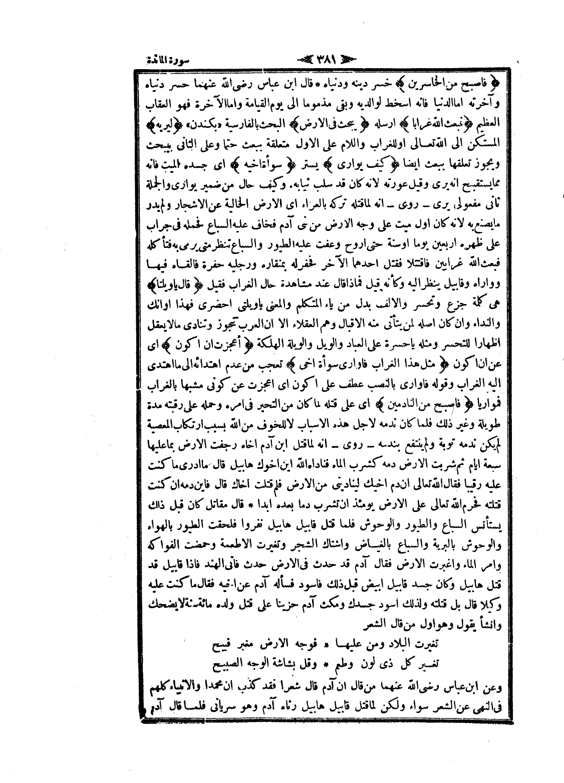 فَأَصْبَحَ مِنَ الْخاسِرِينَ خسر دينه ودنياه قال ابن عباس رضى الله عنهما حسر دنياه وآخرته اما الدنيا فانه أسخط لوالديه وبقي مذموما الى يوم القيامة واما الآخرة فهو العقاب العظيم فَبَعَثَ اللَّهُ غُراباً أرسله يَبْحَثُ فِي الْأَرْضِ البحث بالفارسية «بكندن» لِيُرِيَهُ المستكن الى الله تعالى او للغراب واللام على الاول متعلقة ببعث حتما وعلى الثاني بيبحث ويجوز تعلقها ببعث ايضا كَيْفَ يُوارِي يستر سَوْأَةَ أَخِيهِ اى جسده الميت فانه مما يستقبح انه يرى وقيل عورته لانه كان قد سلب ثيابه. وكيف حال من ضمير يوارى والجملة ثانى مفعولى يرى- روى- انه لما قتله تركه بالعراء اى الأرض الخالية عن الأشجار ولم يدر ما يصنع به لانه كان أول ميت على وجه الأرض من بنى آدم فخاف عليه السباع فحمله فى جراب على ظهره أربعين يوما او سنة حتى أروح وعفت عليه الطيور والسباع تنظر متى يرمى به فتأكله فبعث الله غرابين فاقتتلا فقتل أحدهما الآخر فحفر له بمنقاره ورجليه حفرة فالقاه فيها وواراه وقابيل ينظر اليه وكأنه قيل فماذا قال عند مشاهدة حال الغراب فقيل قالَ يا وَيْلَتى هى كلمة جزع وتحسر والالف بدل من ياء المتكلم والمعنى يا ويلتى احضرى فهذا أوانك والنداء وان كان أصله لمن يتأتى منه الإقبال وهم العقلاء الا ان العرب تتجوز وتنادى ما لا يعقل إظهارا للتحسر ومثله يا حسرة على العباد والويل والويلة الهلكة أَعَجَزْتُ أَنْ أَكُونَ اى عن ان أكون مِثْلَ هذَا الْغُرابِ فَأُوارِيَ سَوْأَةَ أَخِي تعجب من عدم اهتدائه الى ما اهتدى اليه الغراب وقوله فاوارى بالنصب عطف على أكون اى أعجزت عن كونى مشبها بالغراب فمواريا فَأَصْبَحَ مِنَ النَّادِمِينَ اى على قتله لما كان من التحير فى امره وحمله على رقبته مدة طويلة وغير ذلك فلما كان ندمه لاجل هذه الأسباب لا للخوف من الله بسبب ارتكاب المعصية لم يكن ندمه توبة ولم ينتفع بندمه- روى- انه لما قتل ابن آدم أخاه رجفت الأرض بما عليها سبعة ايام ثم شربت الأرض دمه كشرب الماء فناداه الله اين أخوك هابيل قال ما أدرى ما كنت عليه رقيبا فقال الله تعالى ان دم أخيك لينادينى من الأرض فلم قتلت أخاك قال فاين دمه ان كنت قتلته فحرم الله تعالى على الأرض يومئذ ان تشرب دما بعده ابدا قال مقاتل كان قبل ذلك يستأنس السباع والطيور والوحوش فلما قتل قابيل هابيل نفروا فلحقت الطيور بالهواء والوحوش بالبرية والسباع بالغياض واشتاك الشجر وتغيرت الاطعمة وحمضت الفواكه وامر الماء واغبرت الأرض فقال آدم قد حدث فى الأرض حدث فاتى الهند فاذا قابيل قد قتل هابيل وكان جسد قابيل ابيض قبل ذلك فاسود فسأله آدم عن أخيه فقال ما كنت عليه وكيلا قال بل قتلته ولذلك اسود جسدك ومكث آدم حزينا على قتل ولده مائة سنة لا يضحك وانشأ يقول وهو أول من قال الشعر