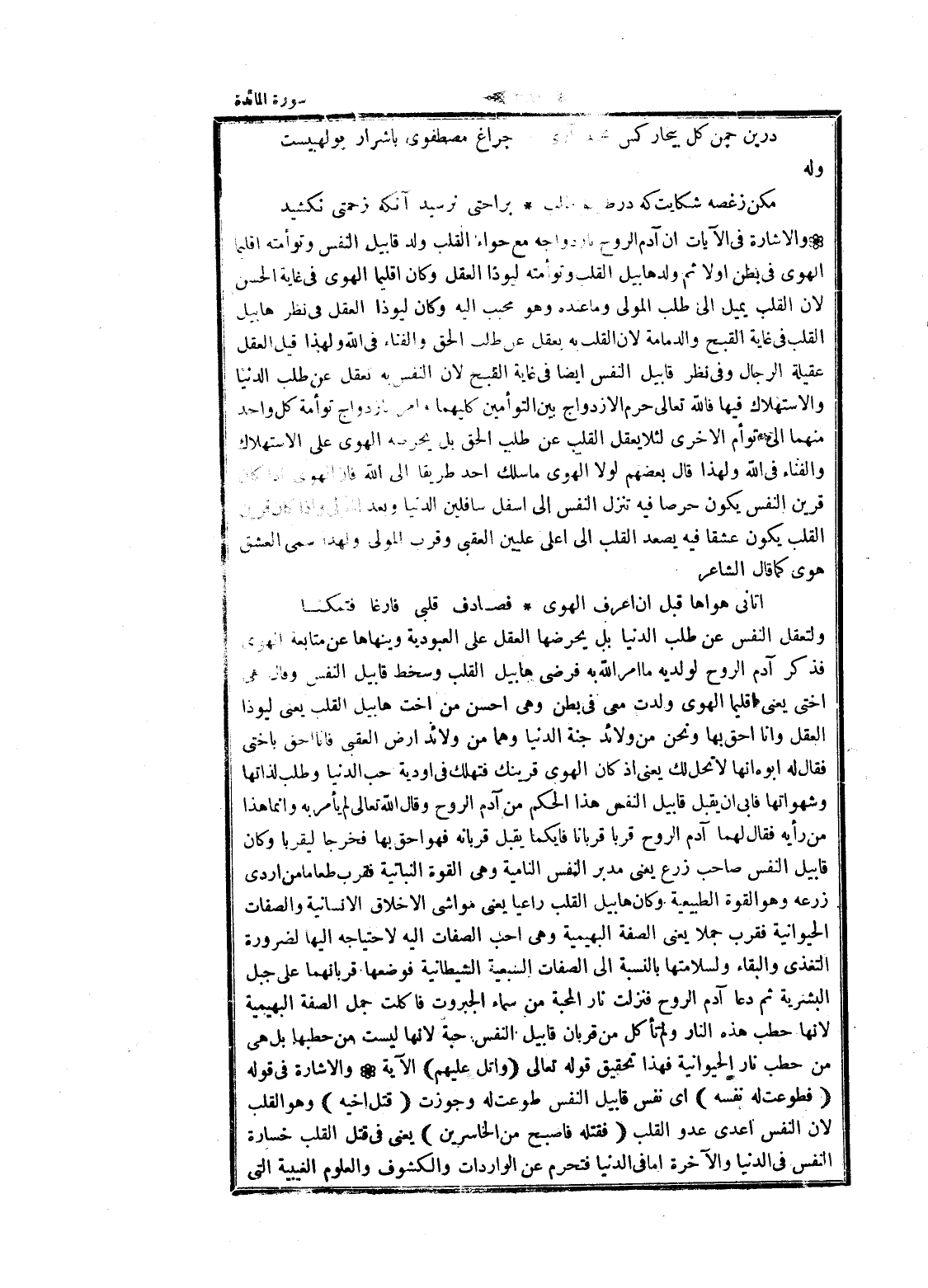 قابيل النفس وقال هى أختي يعنى إقليما الهوى ولدت معى فى بطن وهى احسن من اخت هابيل القلب يعنى ليوذا العقل وانا أحق بها ونحن من ولائد جنة الدنيا وهما من ولائد ارض العقبى فانا أحق بأختي فقال له أبوه انها لا تحل لك يعنى إذ كان الهوى قرينك فتهلك فى اودية حب الدنيا وطلب لذاتها وشهواتها فابى ان يقبل قابيل النفس هذا الحكم من آدم الروح وقال الله تعالى لم يأمر به وانما هذا من رأيه فقال لهما آدم الروح قربا قربانا فايكما يقبل قربانه فهوا حق بها فخرجا ليقربا وكان قابيل النفس صاحب زرع يعنى مدبر النفس النامية وهى القوة النباتية فقرب طعاما من أردى زرعه وهو القوة الطبيعية وكان هابيل القلب راعيا يعنى مواشى الأخلاق الانسانية والصفات الحيوانية فقرب جملا يعنى الصفة البهيمية وهى أحب الصفات اليه لاحتياجه إليها لضرورة التغذي والبقاء ولسلامتها بالنسبة الى الصفات السبعية الشيطانية فوضعها قربانهما على جبل البشرية ثم دعا آدم الروح فنزلت نار المحبة من سماء الجبروت فاكلت جمل الصفة البهيمية لانها حطب هذه النار ولم تأكل من قربان قابيل النفس حبة لانها ليست من حطبها بل هى من حطب نار الحيوانية فهذا تحقيق قوله تعالى وَاتْلُ عَلَيْهِمْ الآية. والاشارة فى قوله فَطَوَّعَتْ لَهُ نَفْسُهُ اى نفس قابيل النفس طوعت له وجوزت قَتْلَ أَخِيهِ وهو القلب لان النفس أعدى عدو القلب فَقَتَلَهُ فَأَصْبَحَ مِنَ الْخاسِرِينَ يعنى فى قتل القلب خسارة النفس فى الدنيا والآخرة اما فى الدنيا فتحرم عن الواردات والكشوف والعلوم الغيبية التي