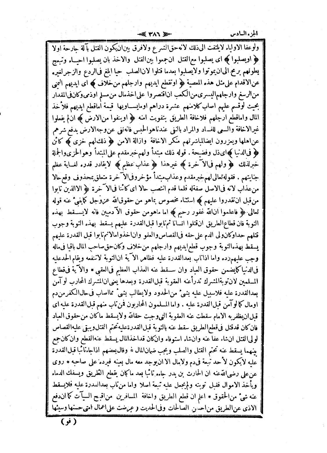 ولو عفا الأولياء لا يلتفت الى ذلك لانه حق الشرع ولا فرق بين ان يكون القتل بآلة جارحة اولا أَوْ يُصَلَّبُوا اى يصلبوا مع القتل ان جمعوا بين القتل والاخذ بان يصلبوا احياء وتبعج بطونهم برمح الى ان يموتوا ولا يصلبوا بعد ما قتلوا لان الصلب حيا ابلغ فى الردع والزجر لغيره عن الاقدام على مثل هذه المعصية أَوْ تُقَطَّعَ أَيْدِيهِمْ وَأَرْجُلُهُمْ مِنْ خِلافٍ اى أيديهم اليمنى من الرسغ وأرجلهم اليسرى من الكعب ان اقتصروا على أخذ مال من مسلم او ذمى وكان فى المقدار بحيث لو قسم عليهم أصاب كلا منهم عشرة دراهم او ما يساويها قيمة اما قطع أيديهم فلأخذ المال واما قطع أرجلهم فلاخافة الطريق بتفويت امنه أَوْ يُنْفَوْا مِنَ الْأَرْضِ ان لم يفعلوا غير الاخافة والسعى للفساد والمراد بالنفي عندنا هو الحبس فانه نفى عن وجه الأرض بدفع شرهم عن أهلها ويعزرون ايضا لمباشرتهم منكر الاخافة وازالة الا من ذلِكَ لَهُمْ خِزْيٌ كائن فِي الدُّنْيا اى ذل وفضيحة. قوله ذلك مبتدأ ولهم خبر مقدم على المبتدأ وهو الخزي والجملة خبر لذلك وَلَهُمْ فِي الْآخِرَةِ غير هذا عَذابٌ عَظِيمٌ لا يقادر قدره لغاية عظم جنايتهم. فقوله تعالى لهم خبر مقدم وعذاب مبتدأ مؤخر وفى الآخرة متعلق بمحذوف وقع حالا من عذاب لانه فى الأصل صفة له فلما قدم انتصب حالا اى كائنا فى الآخرة إِلَّا الَّذِينَ تابُوا مِنْ قَبْلِ أَنْ تَقْدِرُوا عَلَيْهِمْ استثناء مخصوص بما هو من حقوق الله عز وجل كما ينبئ عنه قوله تعالى فَاعْلَمُوا أَنَّ اللَّهَ غَفُورٌ رَحِيمٌ اما ما هو من حقوق الآدميين فانه لا يسقط بهذه التوبة فان قطاع الطريق ان قتلوا إنسانا ثم تابوا قبل القدرة عليهم يسقط بهذه التوبة وجوب قتلهم حدا وكان ولى الدم على حقه فى القصاص والعفو وان أخذوا مالا ثم تابوا قبل القدرة عليهم يسقط بهذه التوبة وجوب قطع أيديهم وأرجلهم من خلاف وكان حق صاحب المال باقيا فى ماله وجب عليهم رده واما إذا تاب بعد القدرة عليه فظاهر الآية ان التوبة لا تنفعه ويقام الحد عليه فى الدنيا كما يضمن حقوق العباد وان سقط عنه العذاب العظيم فى العقبى. والآية فى قطاع المسلمين لان توبة المشرك تدرأ عنه العقوبة قبل القدرة وبعدها يعنى ان المشرك المحارب لو آمن بعد القدرة عليه فلا سبيل عليه بشىء من الحدود ولا يطالب بشىء مما أصاب فى حال الكفر من دم او مال كما لو آمن قبل القدرة عليه. واما المسلمون المحاربون فمن تاب منهم قبل القدرة عليه اى قبل ان يظفر به الامام سقطت عنه العقوبة التي وجبت حقا لله ولا يسقط ما كان من حقوق العباد فان كان قد قتل فى قطع الطريق سقط عنه بالتوبة قبل القدرة عليه تحتم القتل ويبقى عليه القصاص لولى القتل ان شاء عفا عنه وان شاء استوفاه وان كان قد أخذ المال يسقط عنه القطع وان كان جمع بينهما يسقط عنه تحتم القتل والصلب ويجب ضمان المال. وقال بعضهم إذا جاء تائبا قبل القدرة عليه لا يكون لأحد تبعة فى دم ولا مال الا ان يوجد معه مال بعينه فيرده على صاحبه. روى عن على رضى الله عنه ان الحارث بن بدر جاءه تائبا بعد ما كان يقطع الطريق ويسفك الدماء ويأخذ الأموال فقبل توبته ولم يجعل عليه تبعة أصلا واما من تاب بعد القدرة عليه فلا يسقط عنه شىء من الحقوق. اعلم ان قطع الطريق واخافة المسافرين من أقبح السيئات كما ان دفع الأذى عن الطريق من احسن الصالحات وفى الحديث (عرضت على اعمال أمتي حسنها وسيئها