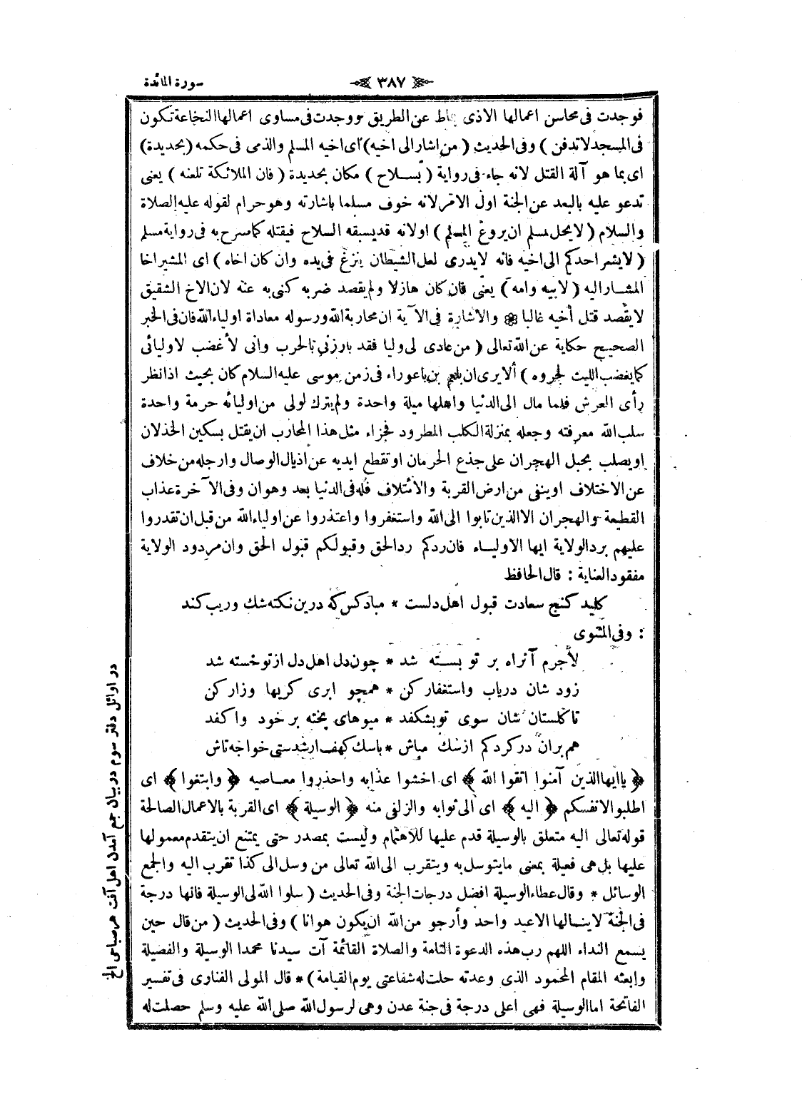 فوجدت فى محاسن أعمالها الأذى يماط عن الطريق ووجدت فى مساوى أعمالها النخاعة تكون فى المسجد لا تدفن) وفى الحديث (من أشار الى أخيه) اى أخيه المسلم والذمي فى حكمه (بحديدة) اى بما هو آلة القتل لانه جاء فى رواية (بسلاح) مكان بحديدة (فان الملائكة تلعنه) يعنى تدعو عليه بالبعد عن الجنة أول الأمر لانه خوف مسلما بإشارته وهو حرام لقوله عليه الصلاة والسلام (لا يحل لمسلم ان يروع المسلم) او لانه قد يسبقه السلاح فيقتله كما صرح به فى رواية مسلم (لا يشر أحدكم الى أخيه فانه لا يدرى لعل الشيطان ينزغ فى يده وان كان أخاه) اى المشير أخا المشار اليه (لا بيه وامه) يعنى فان كان هازلا ولم يقصد ضربه كنى به عنه لان الأخ الشقيق لا يقصد قتل أخيه غالبا. والاشارة فى الآية ان محاربة الله ورسوله معاداة اولياء الله فان فى الخبر الصحيح حكاية عن الله تعالى (من عادى لى وليا فقد بارزني بالحرب وانى لأغضب لاوليائى كما يغضب الليث لجروه) ألا يرى ان بلعم بن باعوراء فى زمن موسى عليه السلام كان بحيث إذا نظر رأى العرش فلما مال الى الدنيا وأهلها ميلة واحدة ولم يترك لولى من أوليائه حرمة واحدة سلب الله معرفته وجعله بمنزلة الكلب المطرود فجزاء مثل هذا المحارب ان يقتل بسكين الخذلان او يصلب بحبل الهجران على جذع الحرمان او تقطع ايديه عن أذيال الوصال وارجله من خلاف عن الاختلاف او ينفى من ارض القربة والائتلاف فله فى الدنيا بعد وهوان وفى الآخرة عذاب القطيعة والهجران الا الذين تابوا الى الله واستغفروا واعتذروا عن اولياء الله من قبل ان تقدروا عليهم برد الولاية ايها الأولياء فان ردكم رد الحق وقبولكم قبول الحق وان مردود الولاية مفقود العناية: قال الحافظ