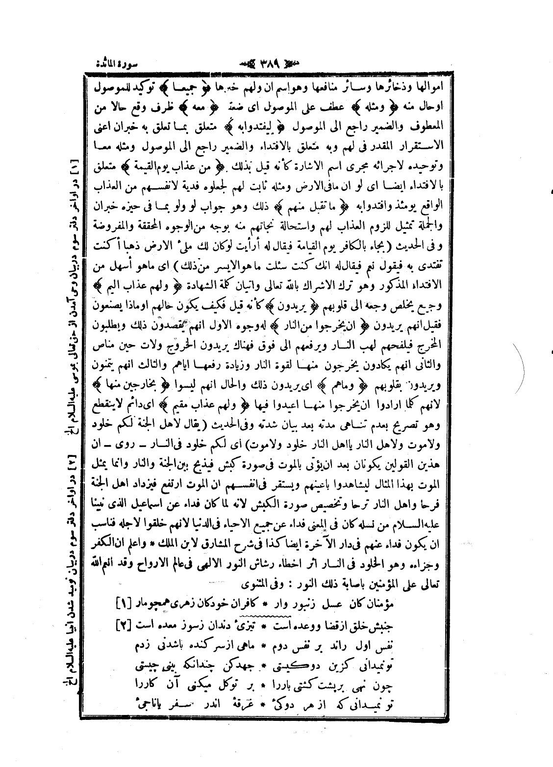 أموالها وذخائرها وسائر منافعها وهو اسم ان ولهم خبرها جَمِيعاً توكيد للموصول او حال منه وَمِثْلَهُ عطف على الموصول اى ضعفه مَعَهُ ظرف وقع حالا من المعطوف والضمير راجع الى الموصول لِيَفْتَدُوا بِهِ متعلق بما تعلق به خبر ان اعنى الاستقرار المقدر فى لهم وبه متعلق بالافتداء والضمير راجع الى الموصول ومثله معا وتوحيده لاجرائه مجرى اسم الاشارة كأنه قيل بذلك مِنْ عَذابِ يَوْمِ الْقِيامَةِ متعلق بالافتداء ايضا اى لو ان ما فى الأرض ومثله ثابت لهم لجعلوه فدية لانفسهم من العذاب الواقع يومئذ وافتدوا به ما تُقُبِّلَ مِنْهُمْ ذلك وهو جواب لو ولو بما فى حيزة خبر ان والجملة تمثيل للزوم العذاب لهم واستحالة نجاتهم منه بوجه من الوجوه المحققة والمفروضة وفى الحديث (بجاء بالكافر يوم القيامة فيقال له أرأيت لو كان لك ملئ الأرض ذهبا أكنت تفتدى به فيقول نعم فيقال له انك كنت سئلت ما هو الأيسر من ذلك) اى ما هو أسهل من الافتداء المذكور وهو ترك الإشراك بالله تعالى وإتيان كلمة الشهادة وَلَهُمْ عَذابٌ أَلِيمٌ وجيع يخلص وجعه الى قلوبهم يُرِيدُونَ كأنه قيل فكيف يكون حالهم او ماذا يصنعون فقيل انهم يريدون أَنْ يَخْرُجُوا مِنَ النَّارِ له وجوه الاول انهم يقصدون ذلك ويطلبون المخرج فيلفحهم لهب النار ويرفعهم الى فوق فهناك يريدون الخروج ولات حين مناص والثاني انهم يكادون يخرجون منها لقوة النار وزيادة رفعها إياهم والثالث انهم يتمنون ويريدون بقلوبهم وَما هُمْ اى يريدون ذلك والحال انهم ليسوا بِخارِجِينَ مِنْها لانهم كلما أرادوا ان يخرجوا منها أعيدوا فيها وَلَهُمْ عَذابٌ مُقِيمٌ اى دائم لا ينقطع وهو تصريح بعدم تناهى مدته بعد بيان شدته وفى الحديث (يقال لاهل الجنة لكم خلود ولا موت ولاهل النار يا اهل النار خلود ولا موت) اى لكم خلود فى النار- روى- ان هذين القولين يكونان بعد ان يؤتى بالموت فى صورة كبش فيذبح بين الجنة والنار وانما يمثل الموت بهذا المثال ليشاهدوا بأعينهم ويستقر فى أنفسهم ان الموت ارتفع فيزداد اهل الجنة فرحا واهل النار ترحا وتخصيص صورة الكبش لانه لما كان فداء عن إسماعيل الذي نبينا عليه السلام من نسله كان فى المعنى فداء عن جميع الاحياء فى الدنيا لانهم خلقوا لاجله فناسب ان يكون فداء عنهم فى دار الآخرة ايضا كذا فى شرح المشارق لابن الملك. واعلم ان الكفر وجزاءه وهو الخلود فى النار اثر اخطاء رشاش النور الإلهي فى عالم الأرواح وقد أنعم الله تعالى على المؤمنين باصابة ذلك النور: وفى المثنوى