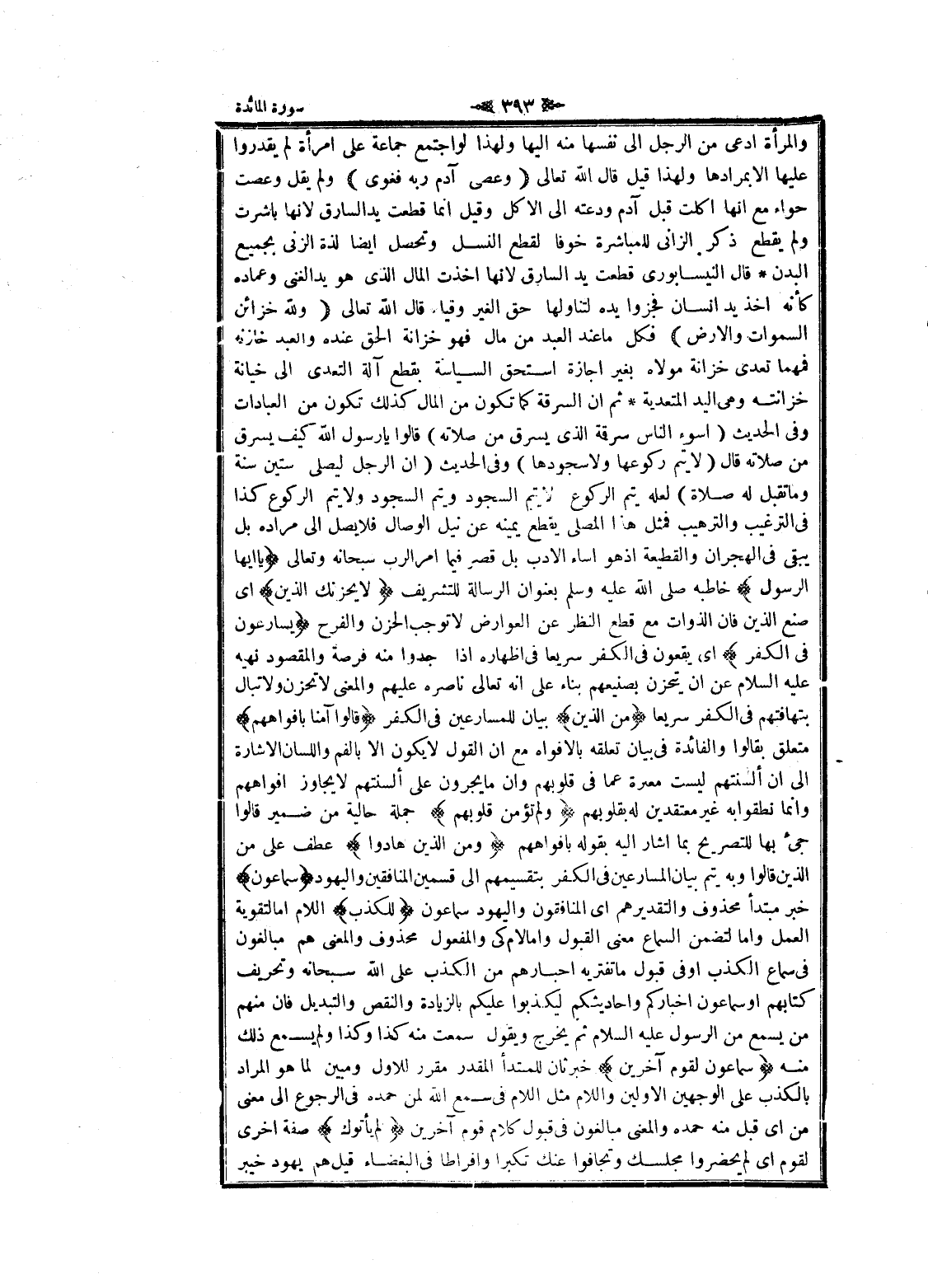 والمرأة ادعى من الرجل الى نفسها منه إليها ولهذا لو اجتمع جماعة على امرأة لم يقدروا عليها الا بمرادها ولهذا قيل قال الله تعالى وَعَصى آدَمُ رَبَّهُ فَغَوى ولم يقل وعصت حواء مع انها أكلت قبل آدم ودعته الى الاكل وقيل انما قطعت يد السارق لانها باشرت ولم يقطع ذكر الزاني للمباشرة خوفا لقطع النسل وتحصل ايضا لذة الزنى بجميع البدن. قال النيسابورى قطعت يد السارق لانها أخذت المال الذي هو يد الغنى وعماده كأنه أخذ يد انسان فجزوا يده لتناولها حق الغير وقيل قال الله تعالى وَلِلَّهِ خَزائِنُ السَّماواتِ وَالْأَرْضِ فكل ما عند العبد من مال فهو خزانة الحق عنده والعبد خازنه فمهما تعدى خزانة مولاه بغير اجازة استحق السياسة بقطع آلة التعدي الى خيانة خزانته وهى اليد المتعدية. ثم ان السرقة كما تكون من المال كذلك تكون من العبادات وفى الحديث (أسوأ الناس سرقة الذي يسرق من صلاته) قالوا يا رسول الله كيف يسرق من صلاته قال (لا يتم ركوعها ولا سجودها) وفى الحديث (ان الرجل ليصلى ستين سنة وما تقبل له صلاة) لعله يتم الركوع ولا يتم السجود ويتم السجود ولا يتم الركوع كذا فى الترغيب والترهيب فمثل هذا المصلى يقطع يمينه عن نيل الوصال فلا يصل الى مراده بل يبقى فى الهجران والقطيعة إذ هو أساء الأدب بل قصر فيما امر الرب سبحانه وتعالى يا أَيُّهَا الرَّسُولُ خاطبه صلى الله عليه وسلم بعنوان الرسالة للتشريف لا يَحْزُنْكَ الَّذِينَ اى صنع الذين فان الذوات مع قطع النظر عن العوارض لا توجب الحزن والفرح يُسارِعُونَ فِي الْكُفْرِ اى يقعون فى الكفر سريعا فى إظهاره إذا وجدوا منه فرصة والمقصود نهيه عليه السلام عن ان يتحزن بصنيعهم بناء على انه تعالى ناصره عليهم والمعنى لا تحزن ولا تبال بتهافتهم فى الكفر سريعا مِنَ الَّذِينَ بيان للمسارعين فى الكفر قالُوا آمَنَّا بِأَفْواهِهِمْ متعلق بقالوا والفائدة فى بيان تعلقه بالأفواه مع ان القول لا يكون الا بالفم واللسان الاشارة الى ان ألسنتهم ليست معبرة عما فى قلوبهم وان ما يجرون على ألسنتهم لا يجاوز أفواههم وانما نطقوا به غير معتقدين له بقلوبهم وَلَمْ تُؤْمِنْ قُلُوبُهُمْ جملة حالية من ضمير قالوا جىء بها للتصريح بما أشار اليه بقوله بأفواههم وَمِنَ الَّذِينَ هادُوا عطف على من الذين قالوا وبه يتم بيان المسارعين فى الكفر بتقسيمهم الى قسمين المنافقين واليهود سَمَّاعُونَ خبر مبتدأ محذوف والتقدير هم اى المنافقون واليهود سماعون لِلْكَذِبِ اللام اما لتقوية العمل واما لتضمن السماع معنى القبول واما لام كى والمفعول محذوف والمعنى هم مبالغون فى سماع الكذب او فى قبول ما تفتريه أحبارهم من الكذب على الله سبحانه وتحريف كتابهم او سماعون اخباركم وأحاديثكم ليكذبوا عليكم بالزيادة والنقص والتبديل فان منهم من يسمع من الرسول عليه السلام ثم يخرج ويقول سمعت منه كذا وكذا ولم يسمع ذلك منه سَمَّاعُونَ لِقَوْمٍ آخَرِينَ خبر ثان للمبتدأ المقدر مقرر للاول ومبين لما هو المراد بالكذب على الوجهين الأولين واللام مثل اللام فى سمع الله لمن حمده فى الرجوع الى معنى من اى قبل منه حمده والمعنى مبالغون فى قبول كلام قوم آخرين لَمْ يَأْتُوكَ صفة اخرى لقوم اى لم يحضروا مجلسك وتجافوا عنك تكبرا وافراطا فى البغضاء قيل هم يهود خيبر