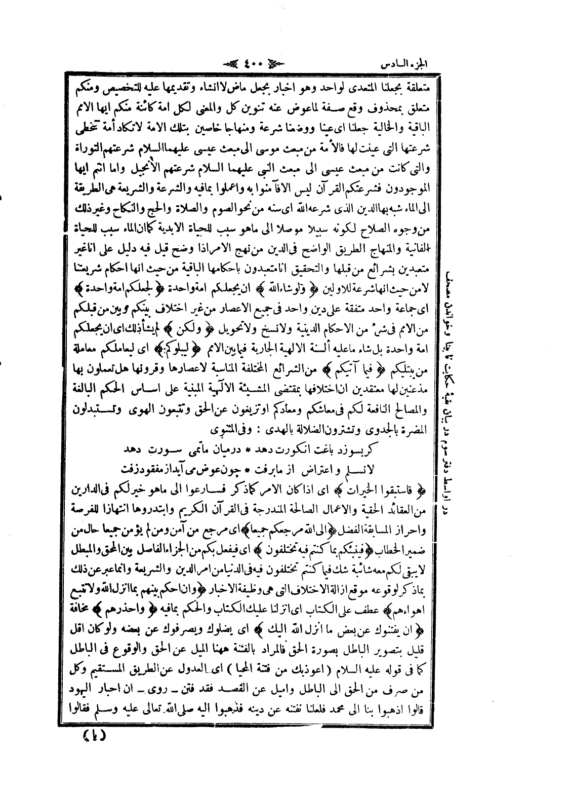 متعلقة بجعلنا المتعدى لواحد وهو اخبار بجعل ماض لا إنشاء وتقديما عليه للتخصيص ومنكم متعلق بمحذوف وقع صفة لما عوض عنه تنوين كل والمعنى لكل امة كائنة منكم ايها الأمم الباقية والخالية جعلنا اى عينا ووضعنا شرعة ومنهاجا خاصين بتلك الامة لا تكاد أمة تتخطى شرعتها التي عينت لها فالأمة من مبعث موسى الى مبعث عيسى عليهما السلام شرعتهم التوراة والتي كانت من مبعث عيسى الى مبعث النبي عليهما السلام شرعتهم الإنجيل واما أنتم ايها الموجودون فشرعتكم القرآن ليس إلا فآمنوا به واعملوا بما فيه والشرعة والشريعة هى الطريقة الى الماء شبه بها الدين الذي شرعه الله اى سنه من نحو الصوم والصلاة والحج والنكاح وغير ذلك من وجوه الصلاح لكونه سبيلا موصلا الى ما هو سبب للحياة الابدية كما ان الماء سبب للحياة الفانية والمنهاج الطريق الواضح فى الدين من نهج الأمر إذا وضح قيل فيه دليل على انا غير متعبدين بشرائع من قبلها والتحقيق انا متعبدون باحكامها الباقية من حيث انها احكام شريعتنا لا من حيث انها شرعة للاولين وَلَوْ شاءَ اللَّهُ ان يجعلكم امة واحدة لَجَعَلَكُمْ أُمَّةً واحِدَةً اى جماعة واحد متفقة على دين واحد فى جميع الاعصار من غير اختلاف بينكم وبين من قبلكم من الأمم فى شىء من الاحكام الدينية ولا نسخ ولا تحويل وَلكِنْ لم يشأ ذلك اى ان يجعلكم امة واحدة بل شاء ما عليه ألسنة الالهية الجارية فيما بين الأمم لِيَبْلُوَكُمْ اى ليعاملكم معاملة من يبتليكم فِي ما آتاكُمْ من الشرائع المختلفة المناسبة لاعصارها وقرونها هل تعملون بها مذعنين لها معتقدين ان اختلافها بمقتضى المشيئة الالهية المبنية على أساس الحكم البالغة والمصالح النافعة لكم فى معاشكم ومعادكم او تزيغون عن الحق وتتبعون الهوى وتستبدلون المضرة بالجدوى وتشترون الضلالة بالهدى: وفى المثنوى