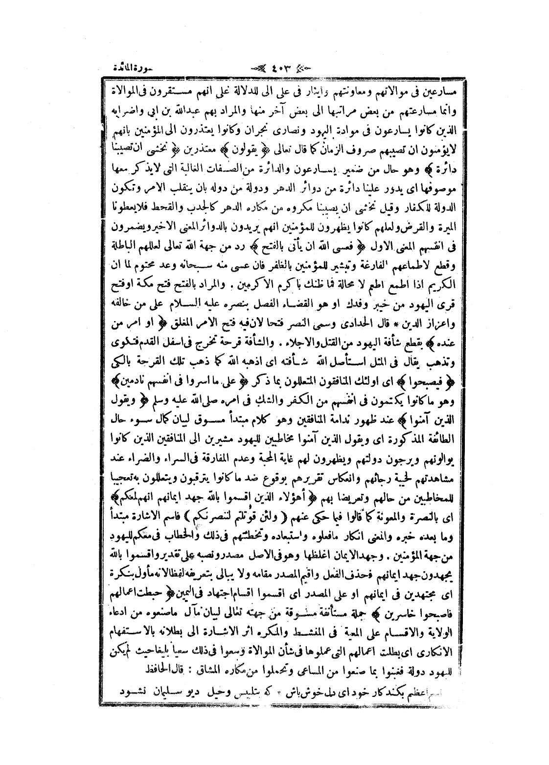 مسارعين فى موالاتهم ومعاونتهم وإيثار فى على الى للدلالة على انهم مستقرون فى الموالاة وانما مسارعتهم من بعض مراتبها الى بعض آخر منها والمراد بهم عبد الله بن ابى واضرابه الذين كانوا يسارعون فى موادة اليهود ونصارى نجران وكانوا يعتدرون الى المؤمنين بانهم لا يؤمنون ان تصيبهم صروف الزمان كما قال تعالى يَقُولُونَ معتذرين نَخْشى أَنْ تُصِيبَنا دائِرَةٌ وهو حال من ضمير يسارعون والدائرة من الصفات الغالبة التي لا يذكر معها موصوفها اى يدور علينا دائرة من دوائر الدهر ودولة من دوله بان ينقلب الأمر وتكون الدولة للكفار وقيل نخشى ان يصيبنا مكروه من مكاره الدهر كالجدب والقحط فلا يعطونا الميرة والقرض ولعلهم كانوا يظهرون للمؤمنين انهم يريدون بالدوائر المعنى الأخير ويضمرون فى أنفسهم المعنى الاول فَعَسَى اللَّهُ أَنْ يَأْتِيَ بِالْفَتْحِ رد من جهة الله تعالى لعللهم الباطلة وقطع لاطماعهم الفارغة وتبشير للمؤمنين بالظفر فان عسى منه سبحانه وعد محتوم لما ان الكريم إذا أطمع اطعم لا محالة فما ظنك بأكرم الأكرمين. والمراد بالفتح فتح مكة او فتح قرى اليهود من خيبر وفدك او هو القضاء الفصل بنصره عليه السلام على من خالفه وإعزاز الدين. قال الحدادي وسمى النصر فتحا لان فيه فتح الأمر المغلق أَوْ أَمْرٍ مِنْ عِنْدِهِ بقطع شأفة اليهود من القتل والاجلاء. والشأفة قرحة تخرج فى أسفل القدم فتكوى وتذهب يقال فى المثل استأصل الله شأفته اى أذهبه الله كما ذهب تلك القرحة بالكي فَيُصْبِحُوا اى أولئك المنافقون المتعللون بما ذكر عَلى ما أَسَرُّوا فِي أَنْفُسِهِمْ نادِمِينَ وهو ما كانوا يكتمون فى أنفسهم من الكفر والشك فى امره صلى الله عليه وسلم وَيَقُولُ الَّذِينَ آمَنُوا عند ظهور ندامة المنافقين وهو كلام مبتدأ مسوق لبيان كمال سوء حال الطائفة المذكورة اى ويقول الذين آمنوا مخاطبين لليهود مشيرين الى المنافقين الذين كانوا يوالونهم ويرجون دولتهم ويظهرون لهم غاية المحبة وعدم المفارقة فى السراء والضراء عند مشاهدتهم لخيبة رجائهم وانعكاس تقريرهم بوقوع ضد ما كانوا يترقبون ويتعللون به تعجيبا للمخاطبين من حالهم وتعريضا بهم أَهؤُلاءِ الَّذِينَ أَقْسَمُوا بِاللَّهِ جَهْدَ أَيْمانِهِمْ إِنَّهُمْ لَمَعَكُمْ اى بالنصرة والمعونة كما قالوا فيما حكى عنهم وَإِنْ قُوتِلْتُمْ لَنَنْصُرَنَّكُمْ فاسم الاشارة مبتدأ وما بعده خبره والمعنى انكار ما فعلوه واستبعاده وتخطئتهم فى ذلك والخطاب فى معكم لليهود من جهة المؤمنين. وجهد الايمان أغلظها وهو فى الأصل مصدر ونصبه على تقدير واقسموا بالله يجهدون جهد ايمانهم فحذف الفعل وأقيم المصدر مقامه ولا يبالى بتعريفه لفظا لانه مأول بنكرة اى مجتهدين فى ايمانهم او على المصدر اى اقسموا اقسام اجتهاد فى اليمين حَبِطَتْ أَعْمالُهُمْ فَأَصْبَحُوا خاسِرِينَ جملة مستأنفة مسوقة من جهته تعالى لبيان مآل ما صنعوه من ادعاء الولاية والاقسام على المعية فى المنشط والمكره أثر الاشارة الى بطلانه بالاستفهام الإنكاري اى بطلت أعمالهم التي عملوها فى شأن الموالاة وسعوا فى ذلك سعيا بليغا حيث لم يكن لليهود دولة فغبنوا بما صنعوا من المساعى وتحملوا من مكاره المشاق: قال الحافظ