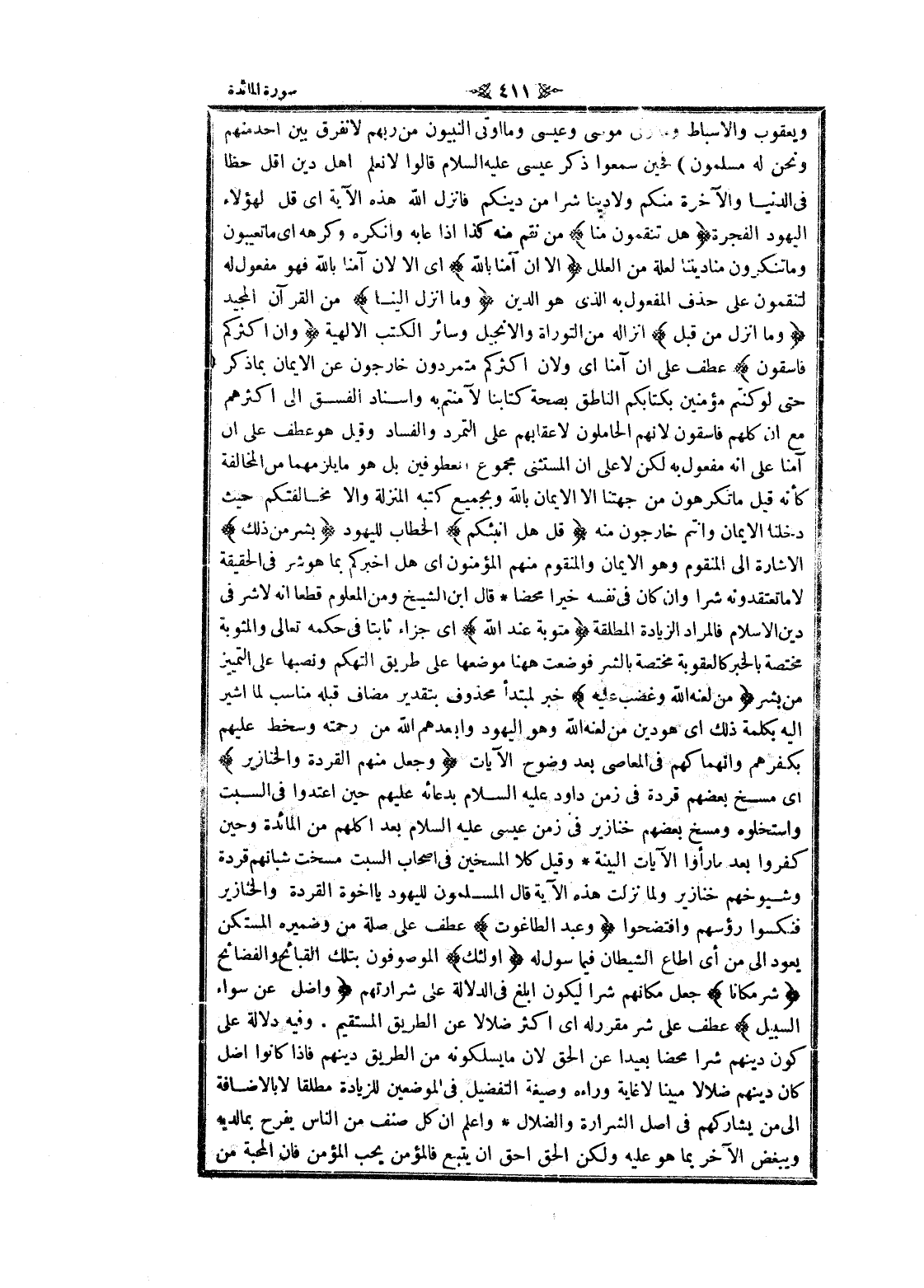 ويعقوب والأسباط وما اوتى موسى وعيسى وما اوتى النبيون من ربهم لا نفرق بين أحد منهم ونحن له مسلمون) فحين سمعوا ذكر عيسى عليه السلام قالوا لا نعلم اهل دين اقل حظا فى الدنيا والآخرة منكم ولا دينا شرا من دينكم فانزل الله هذه الآية اى قل لهؤلاء اليهود الفجرة هَلْ تَنْقِمُونَ مِنَّا من نقم منه كذا إذا عابه وأنكره وكرهه اى ما تعيبون وما تنكرون مناديننا لعلة من العلل إِلَّا أَنْ آمَنَّا بِاللَّهِ اى الا لان آمنا بالله فهو مفعول له لتنقمون على حذف المفعول به الذي هو الدين وَما أُنْزِلَ إِلَيْنا من القرآن المجيد وَما أُنْزِلَ مِنْ قَبْلُ انزاله من التوراة والإنجيل وسائر الكتب الالهية وَأَنَّ أَكْثَرَكُمْ فاسِقُونَ عطف على ان آمنا اى ولان أكثركم متمردون خارجون عن الايمان بما ذكر حتى لو كنتم مؤمنين بكتابكم الناطق بصحة كتابنا لآمنتم به واسناد الفسق الى أكثرهم مع ان كلهم فاسقون لانهم الحاملون لا عقابهم على التمرد والفساد وقيل هو عطف على ان آمنا على انه مفعول به لكن لا على ان المستثنى مجموع المعطوفين بل هو ما يلزمهما من المخالفة كأنه قيل ما تكرهون من جهتنا الا الايمان بالله وبجميع كتبه المنزلة والا مخالفتكم حيث دخلنا الايمان وأنتم خارجون منه قُلْ هَلْ أُنَبِّئُكُمْ الخطاب لليهود بِشَرٍّ مِنْ ذلِكَ الاشارة الى المنقوم وهو الايمان والمنقوم منهم المؤمنون اى هل أخبركم بما هو شر فى الحقيقة لا ما تعتقدونه شرا وان كان فى نفسه خيرا محضا. قال ابن الشيخ ومن المعلوم قطعا انه لا شر فى دين الإسلام فالمراد الزيادة المطلقة مَثُوبَةً عِنْدَ اللَّهِ اى جزاء ثابتا فى حكمه تعالى والمثوبة مختصة بالخبر كالعقوبة مختصة بالشر فوضعت هاهنا موضعها على طريق التهكم ونصبها على التمييز من بشر مَنْ لَعَنَهُ اللَّهُ وَغَضِبَ عَلَيْهِ خبر لمبتدأ محذوف بتقدير مضاف قبله مناسب لما أشير اليه بكلمة ذلك اى هو دين من لعنه الله وهو اليهود وابعدهم الله من رحمته وسخط عليهم بكفرهم وانهماكهم فى المعاصي بعد وضوح الآيات وَجَعَلَ مِنْهُمُ الْقِرَدَةَ وَالْخَنازِيرَ اى مسخ بعضهم قردة فى زمن داود عليه السلام بدعائه عليهم حين اعتدوا فى السبت واستخلوه ومسخ بعضهم خنازير فى زمن عيسى عليه السلام بعد أكلهم من المائدة وحين كفروا بعد مارأوا الآيات البينة. وقيل كلا المسخين فى اصحاب السبت مسخت شبانهم قردة وشيوخهم خنازير ولما نزلت هذه الآية قال المسلمون لليهود يا اخوة القردة والخنازير فنكسوا رؤسهم وافتضحوا وَعَبَدَ الطَّاغُوتَ عطف على صلة من وضميره المستكن يعود الى من أي أطاع الشيطان فيما سول له أُولئِكَ الموصوفون بتلك القبائح والفضائح شَرٌّ مَكاناً جعل مكانهم شرا ليكون ابلغ فى الدلالة على شرارتهم وَأَضَلُّ عَنْ سَواءِ السَّبِيلِ عطف على شر مقرر له اى اكثر ضلالا عن الطريق المستقيم. وفيه دلالة على كون دينهم شرا محضا بعيدا عن الحق لان ما يسلكونه من الطريق دينهم فاذا كانوا أضل كان دينهم ضلالا مبينا لا غاية وراءه وصيغة التفضيل فى الموضعين للزيادة مطلقا لا بالاضافة الى من يشاركهم فى اصل الشرارة والضلال. واعلم ان كل صنف من الناس يفرح بما لديه ويبغض الآخر بما هو عليه ولكن الحق أحق ان يتبع فالمؤمن يحب المؤمن فان المحبة من