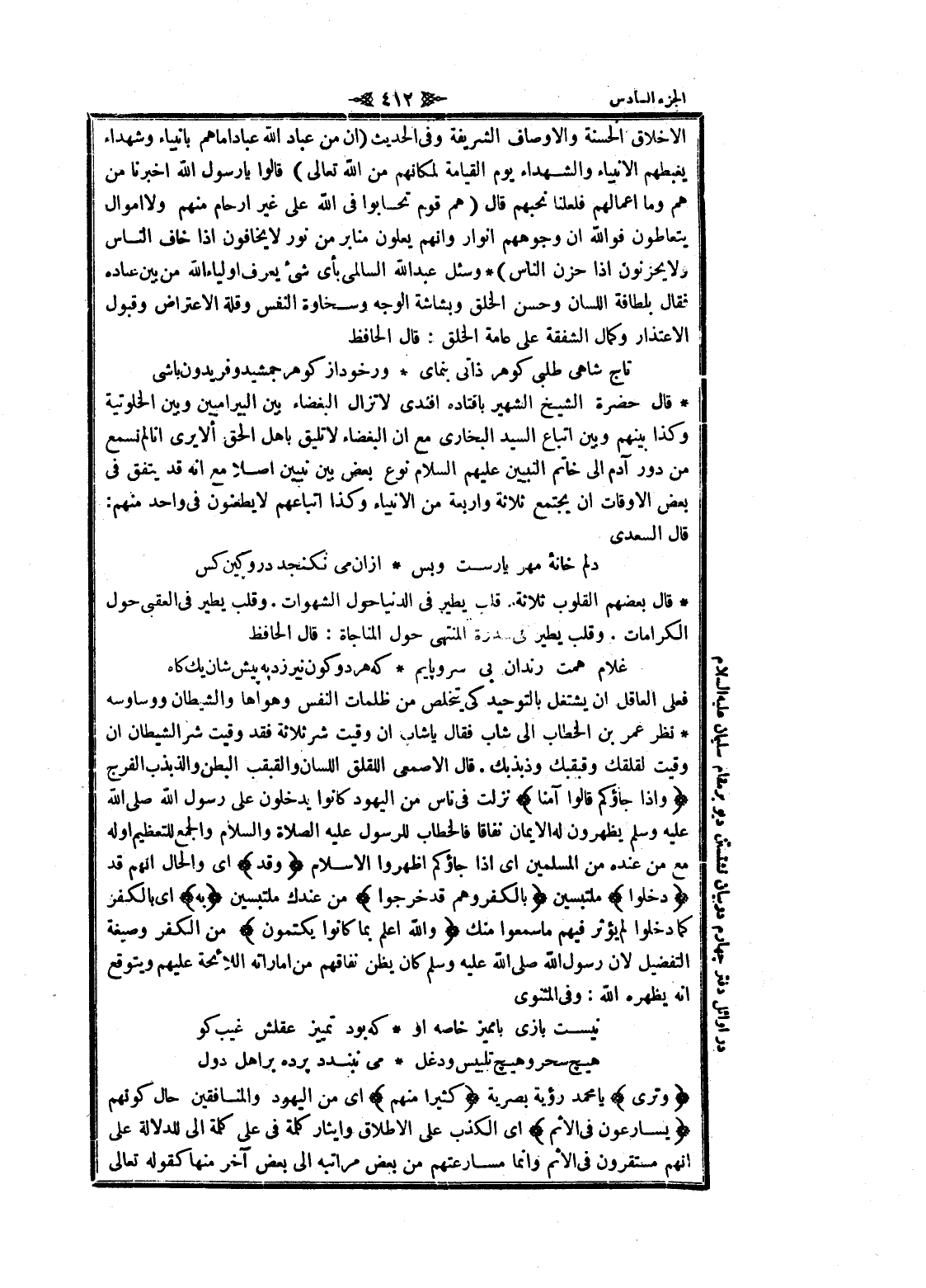 الأخلاق الحسنة والأوصاف الشريفة وفى الحديث (ان من عباد الله عبادا ما هم بانبياء وشهداء يغبطهم الأنبياء والشهداء يوم القيامة لمكانهم من الله تعالى) قالوا يا رسول الله أخبرنا من هم وما أعمالهم فلعلنا نحبهم قال (هم قوم تحابوا فى الله على غير أرحام منهم ولا اموال يتعاطون فو الله ان وجوههم أنوار وانهم يعلون منابر من نور لا يخافون إذا خاف الناس ولا يحزنون إذا حزن الناس) . وسئل عبد الله السالمى بأى شىء يعرف اولياء الله من بين عباده فقال بلطافة اللسان وحسن الخلق وبشاشة الوجه وسخاوة النفس وقلة الاعتراض وقبول الاعتذار وكمال الشفقة على عامة الخلق: قال الحافظ