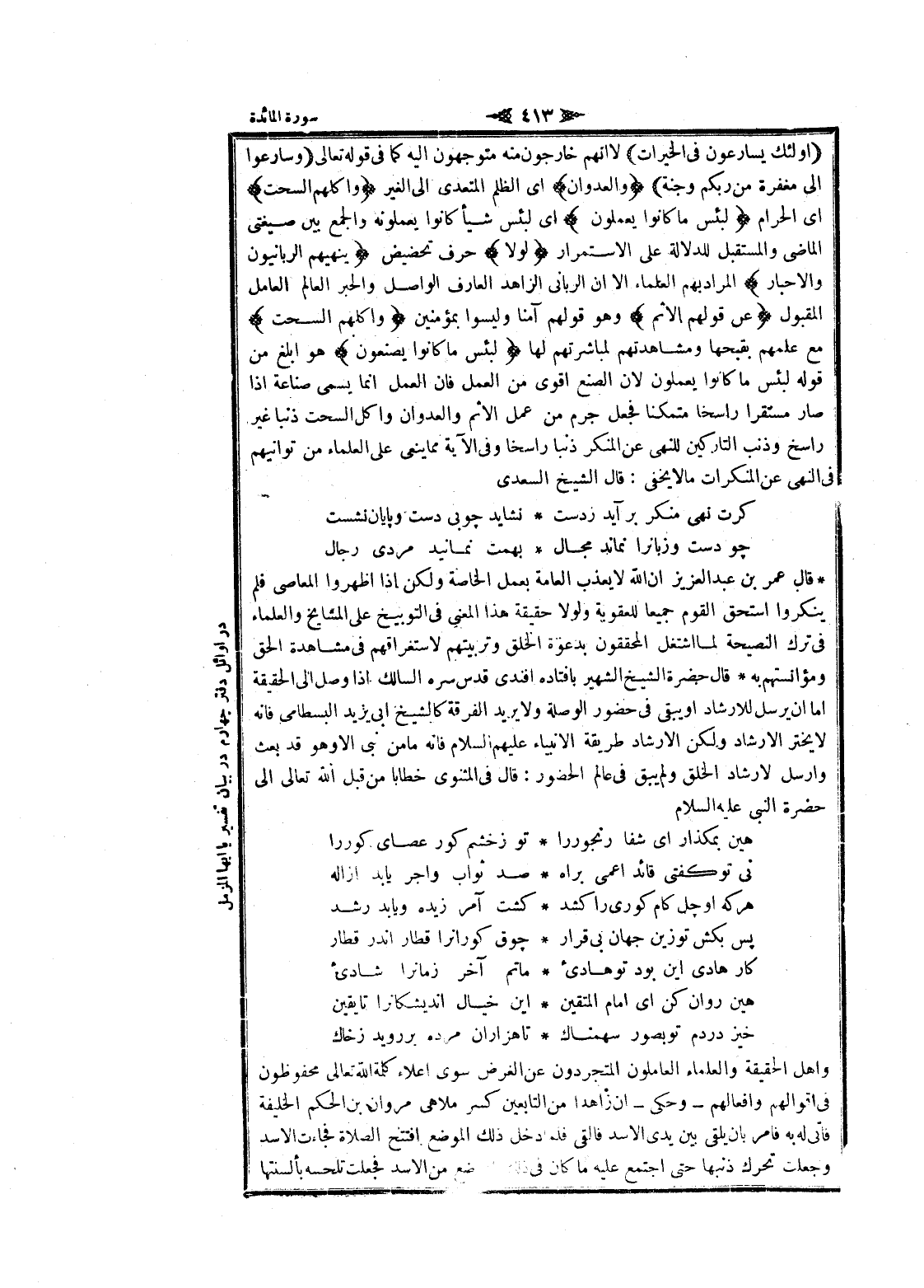 قال عمر بن عبد العزيز ان الله لا يعذب العامة بعمل الخاصة ولكن إذا أظهروا المعاصي فلم ينكروا استحق القوم جميعا للعقوبة ولولا حقيقة هذا المعنى فى التوبيخ على المشايخ والعلماء فى ترك النصيحة لما اشتغل المحققون بدعوة الخلق وتربيتهم لاستغراقهم فى مشاهدة الحق ومؤانستهم به. قال حضرة الشيخ الشهير بافتاده افندى قدس سره السالك إذا وصل الى الحقيقة اما ان يرسل للارشاد او يبقى فى حضور الوصلة ولا يريد الفرقة كالشيخ ابى يزيد البسطامي فانه لا يختر الإرشاد ولكن الإرشاد طريقة الأنبياء عليهم السلام فانه ما من نبى الا وهو قد بعث وأرسل لارشاد الخلق ولم يبق فى عالم الحضور: قال فى المثنوى خطابا من قبل الله تعالى الى حضرة النبي عليه السلام