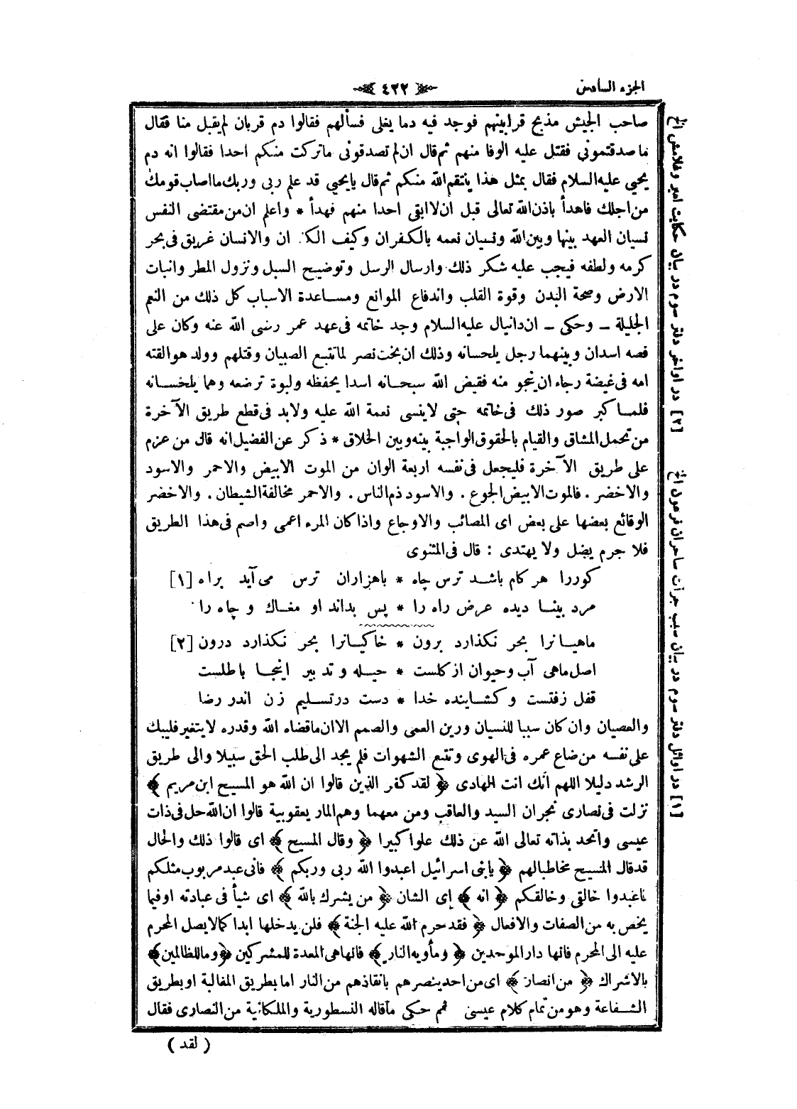 صاحب الجيش مذبح قرابينهم فوجد فيه دما يغلى فسألهم فقالوا دم قربان لم يقبل منا فقال ما صدقتمونى فقتل عليه الوفا منهم ثم قال ان لم تصدقونى ما تركت منكم أحدا فقالوا انه دم يحيى عليه السلام فقال بمثل هذا ينتقم الله منكم ثم قال يا يحيى قد علم ربى وربك ما أصاب قومك من أجلك فاهدأ بإذن الله تعالى قبل ان لا أبقى أحدا منهم فهدأ. واعلم ان من مقتضى النفس نسيان العهد بينها وبين الله ونسيان نعمه بالكفران وكيف الكفران والإنسان غريق فى بحر كرمه ولطفه فيجب عليه شكر ذلك وإرسال الرسل وتوضيح السبل ونزول المطر وإنبات الأرض وصحة البدن وقوة القلب واندفاع الموانع ومساعدة الأسباب كل ذلك من النعم الجليلة- وحكى- ان دانيال عليه السلام وجد خاتمه فى عهد عمر رضى الله عنه وكان على فصه أسدان وبينهما رجل يلحسانه وذلك ان بخت نصر لما تتبع الصبيان وقتلهم وولد هو ألقته امه فى غيضة رجاء ان ينجو منه فقيض الله سبحانه أسدا يحفظه ولبوة ترضعه وهما يلخسانه فلما كبر صور ذلك فى خاتمه حتى لا ينسى نعمة الله عليه ولا بد فى قطع طريق الآخرة من تحمل المشاق والقيام بالحقوق الواجبة بينه وبين الخلاق. ذكر عن الفضيل انه قال من عزم على طريق الآخرة فليجعل فى نفسه اربعة ألوان من الموت الأبيض والأحمر والأسود والأخضر. فالموت الأبيض الجوع. والأسود ذم الناس. والأحمر مخالفة الشيطان. والأخضر الوقائع بعضها على بعض اى المصائب والأوجاع وإذا كان المرء أعمى وأصم فى هذا الطريق فلا جرم يضل ولا يهتدى: قال فى المثنوى