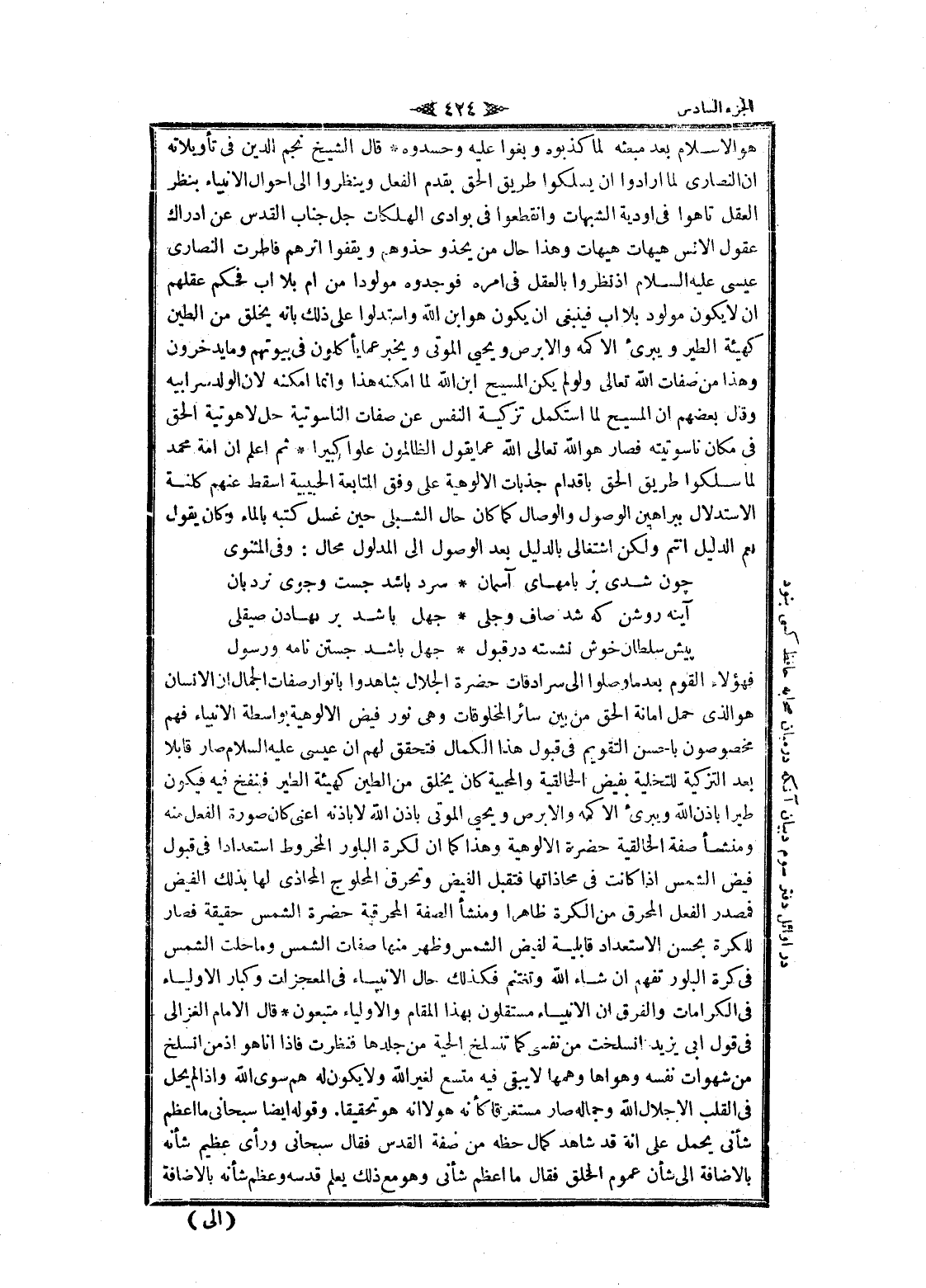 امكنه لان الولد سرابيه وقال بعضهم ان المسيح لما استكمل تزكية النفس عن صفات الناسوتية حل لاهوتية الحق فى مكان ناسوتيته فصار هو الله تعالى الله عما يقول الظالمون علوا كبيرا. ثم اعلم ان امة محمد لما سلكوا طريق الحق باقدام جذبات الالوهية على وفق المتابعة الحبيبية أسقط عنهم كلفة الاستدلال ببراهين الوصول والوصال كما كان حال الشبلي حين غسل كتبه بالماء وكان يقول نعم الدليل أنتم ولكن اشتغالي بالدليل بعد الوصول الى المدلول محال: وفى المثنوى