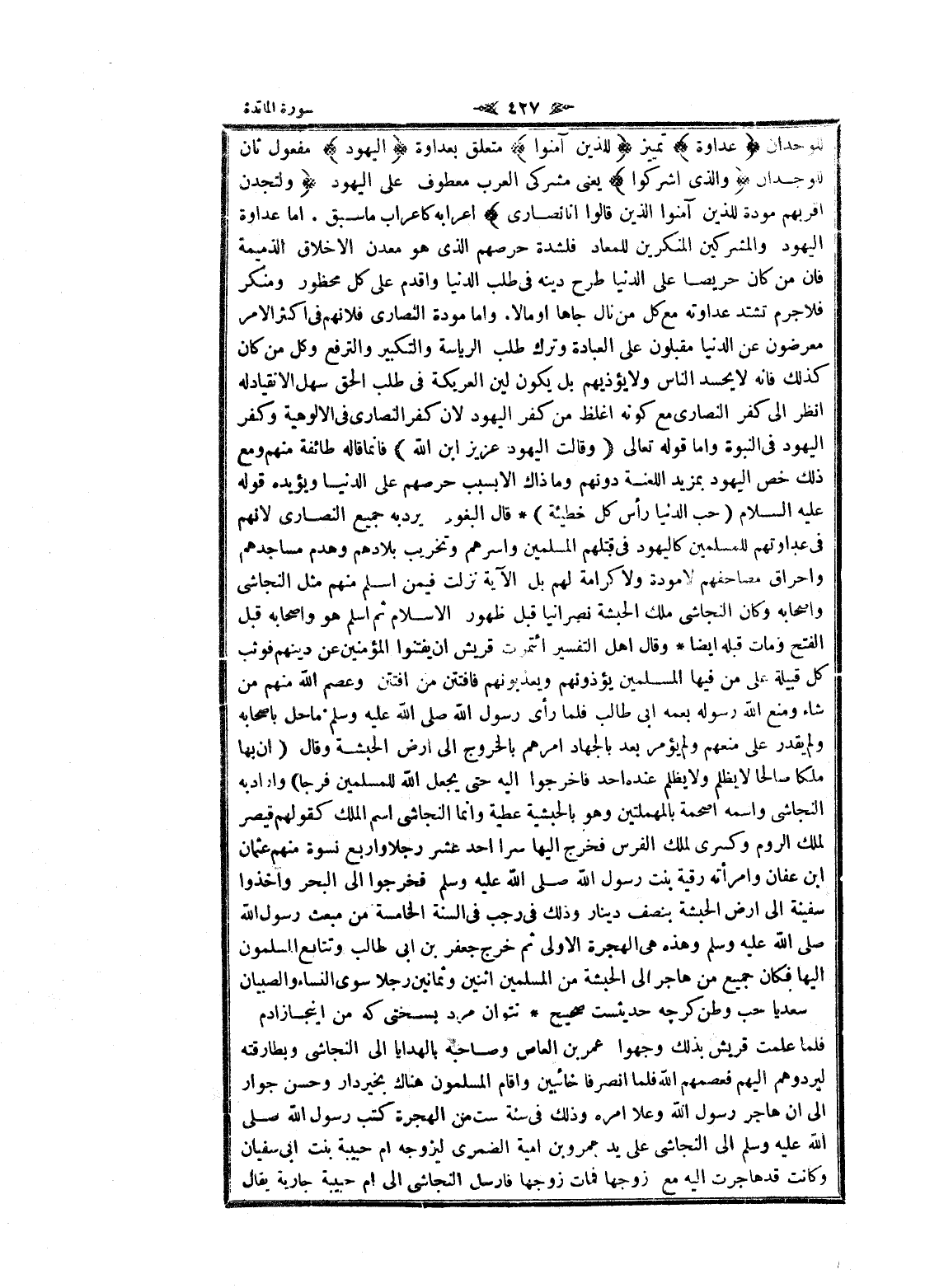 للوجدان عَداوَةً تمييز لِلَّذِينَ آمَنُوا متعلق بعداوة الْيَهُودَ مفعول ثان للوجدان وَالَّذِينَ أَشْرَكُوا يعنى مشركى العرب معطوف على اليهود وَلَتَجِدَنَّ أَقْرَبَهُمْ مَوَدَّةً لِلَّذِينَ آمَنُوا الَّذِينَ قالُوا إِنَّا نَصارى إعرابه كاعراب ما سبق. اما عداوة اليهود والمشركين المنكرين للمعاد فلشدة حرصهم الذي هو معدن الأخلاق الذميمة فان من كان حريصا على الدنيا طرح دينه فى طلب الدنيا واقدم على كل محظور ومنكر فلا جرم تشتد عداوته مع كل من نال جاها او مالا. واما مودة النصارى فلانهم فى اكثر الأمر معرضون عن الدنيا مقبلون على العبادة وترك طلب الرياسة والتكبير والترفع وكل من كان كذلك فانه لا يحسد الناس ولا يؤذيهم بل يكون لين العريكة فى طلب الحق سهل الانقياد له انظر الى كفر النصارى مع كونه اغلظ من كفر اليهود لان كفر النصارى فى الألوهية وكفر اليهود فى النبوة واما قوله تعالى وَقالَتِ الْيَهُودُ عُزَيْرٌ ابْنُ اللَّهِ فانما قاله طائفة منهم ومع ذلك خص اليهود بمزيد اللعنة دونهم وما ذاك الا بسبب حرصهم على الدنيا ويؤيده قوله عليه السلام (حب الدنيا رأس كل خطيئة) قال البغوي لم يرد به جميع النصارى لانهم فى عداوتهم للمسلمين كاليهود فى قتلهم المسلمين واسرهم وتخريب بلادهم وهدم مساجدهم وإحراق مصاحفهم لا مودة ولا كرامة لهم بل الآية نزلت فيمن اسلم منهم مثل النجاشي وأصحابه وكان النجاشي ملك الحبشة نصرانيا قبل ظهور الإسلام ثم اسلم هو وأصحابه قبل الفتح ومات قبله ايضا وقال اهل التفسير ائتمرت قريش ان يفتنوا المؤمنين عن دينهم فوثب كل قبيلة على من فيها المسلمين يؤذونهم ويعذبونهم فافتتن من افتتن وعصم الله منهم من شاء ومنع الله رسوله بعمه ابى طالب فلما رأى رسول الله صلى الله عليه وسلم ما حل بأصحابه ولم يقدر على منعهم ولم يؤمر بعد بالجهاد أمرهم بالخروج الى ارض الحبشة وقال (ان بها ملكا صالحا لا يظلم ولا يظلم عنده أحد فاخرجوا اليه حتى يجعل الله للمسلمين فرجا) وأراد به النجاشي واسمه اصحمة بالمهملتين وهو بالحبشية عطية وانما النجاشي اسم الملك كقولهم قيصر لملك الروم وكسرى لملك الفرس فخرج إليها سرا أحد عشر رجلا واربع نسوة منهم عثمان ابن عفان وامرأته رقية بنت رسول الله صلى الله عليه وسلم فخرجوا الى البحر وأخذوا سفينة الى ارض الحبشة بنصف دينار وذلك فى رجب فى السنة الخامسة من مبعث رسول الله صلى الله عليه وسلم وهذه هى الهجرة الاولى ثم خرج جعفر بن ابى طالب وتتابع المسلمون إليها فكان جميع من هاجر الى الحبشة من المسلمين اثنين وثمانين رجلا سوى النساء والصبيان