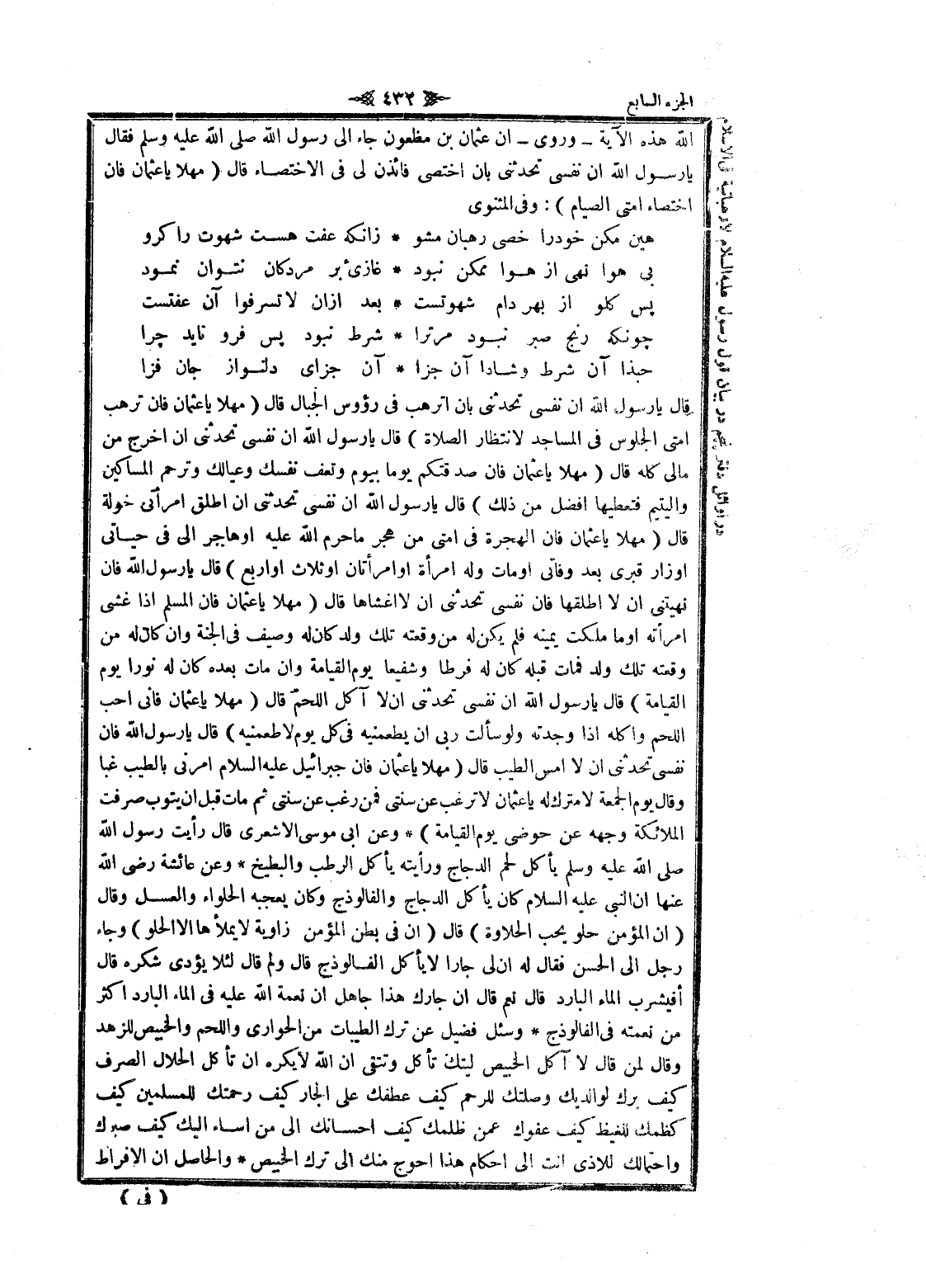 الله هذه الآية- وروى- ان عثمان بن مظعون جاء الى رسول الله صلى الله عليه وسلم فقال يا رسول الله ان نفسى تحدثنى بان اختصى فائذن لى فى الاختصاء قال (مهلا يا عثمان فان اختصاء أمتي الصيام) : وفى المثنوى