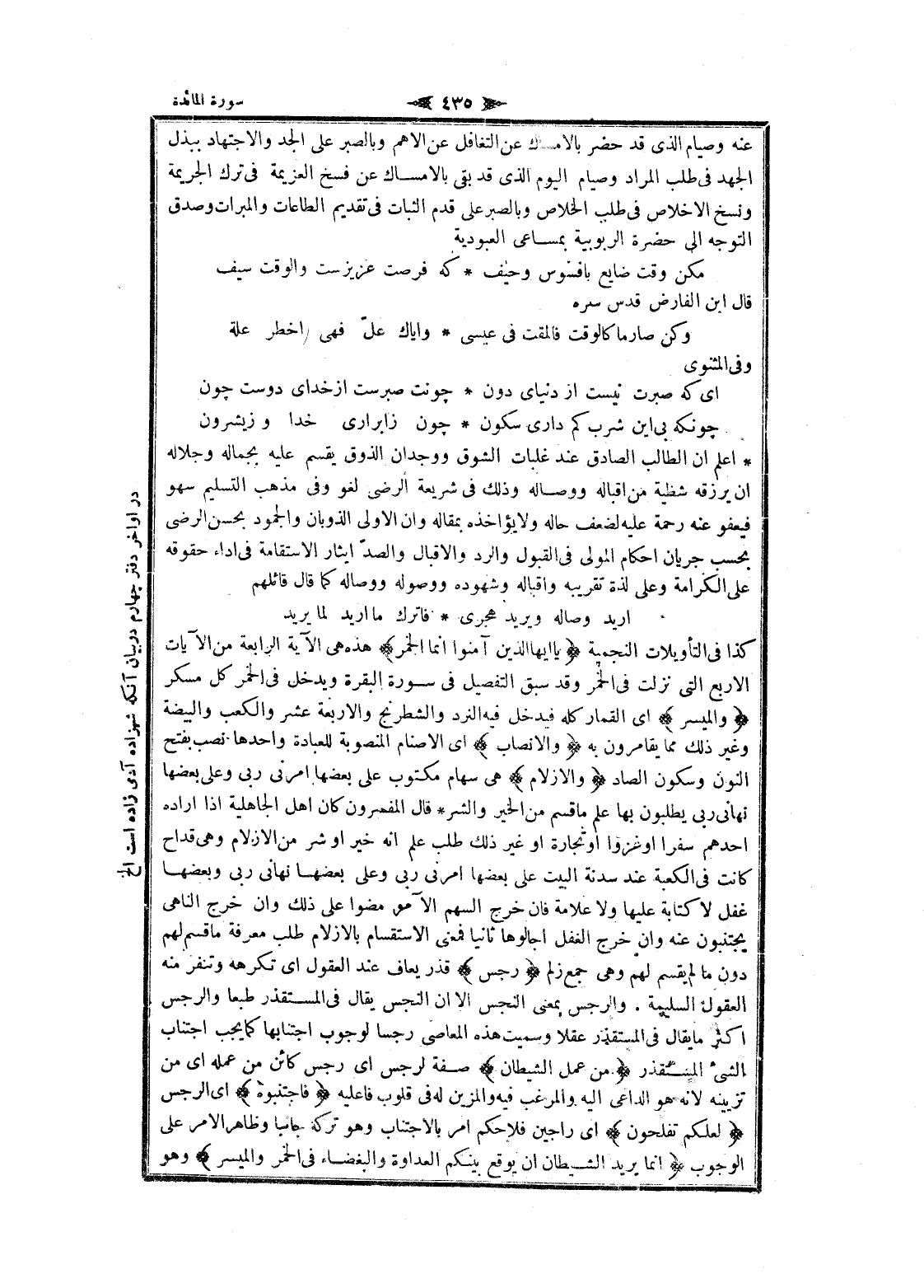 اعلم ان الطالب الصادق عند غلبات الشوق ووجدان الذوق يقسم عليه بجماله وجلاله ان يرزقه شظية من إقباله ووصاله وذلك فى شريعة الرضى لغو وفى مذهب التسليم سهو فيعفو عنه رحمة عليه لضعف حاله ولا يؤاخذه بمقاله وان الاولى الذوبان والجمود بحسن الرضى بحسب جريان احكام المولى فى القبول والرد والإقبال والصدّ إيثار الاستقامة فى أداء حقوقه على الكرامة وعلى لذة تقريبه وإقباله وشهوده ووصوله ووصاله كما قال قائلهم
