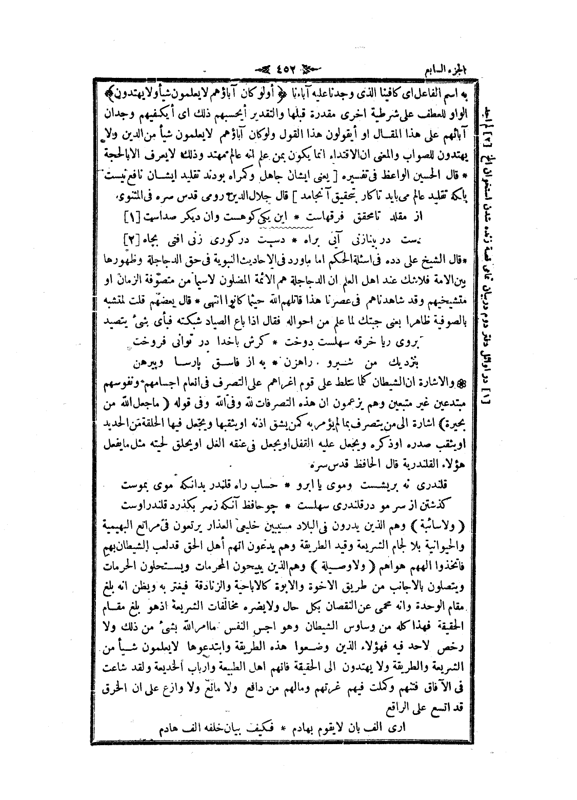 وَلا سائِبَةٍ وهم الذين يدرون فى البلاد مسيبين خليعى العذار يرتعون فى مراتع البهيمية والحيوانية بلا لجام الشريعة وقيد الطريقة وهم يدعون انهم أهل الحق قد لعب الشيطان بهم فاتخذوا إلههم هو أهم وَلا وَصِيلَةٍ وهم الذين يبيحون المحرمات ويستحلون الحرمات ويتصلون بالاجانب من طريق الاخوة والابوة كالاباحية والزنادقة فيغتر به ويظن انه بلغ مقام الوحدة وانه محمى عن النقصان بكل حال ولا يضره مخالفات الشريعة إذ هو بلغ مقام الحقيقة فهذا كله من وساوس الشيطان وهواجس النفس ما امر الله بشىء من ذلك ولا رخص لاحد فيه فهؤلاء الذين وضعوا هذه الطريقة وابتدعوها لا يعلمون شيأ من الشريعة والطريقة ولا يهتدون الى الحقيقة فانهم اهل الطبيعة وارباب الخديعة ولقد شاعت فى الآفاق فتنهم وكملت فيهم غرتهم ومالهم من دافع ولا مانع ولا وازع على ان الخرق قد اتسع على الراقع