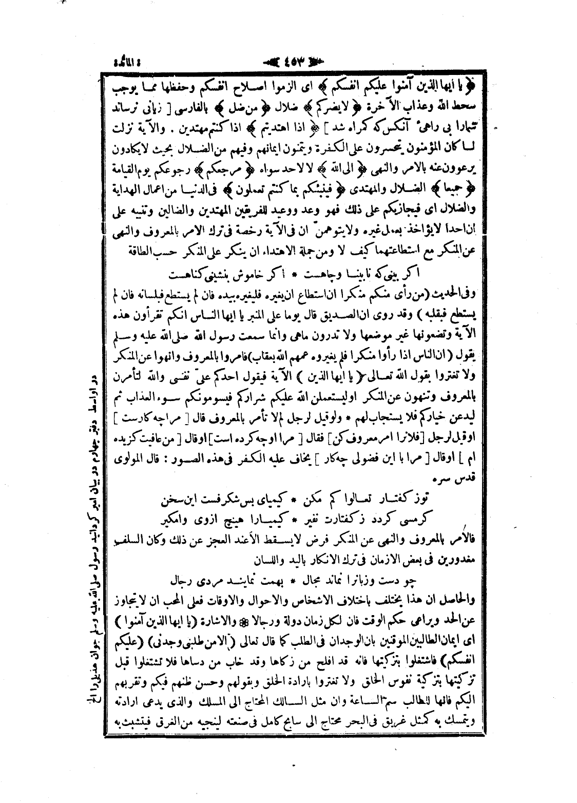 وفى الحديث (من رأى منكم منكرا ان استطاع ان يغيره فليغيره بيده فان لم يستطع فبلسانه فان لم يستطع فبقلبه) وقد روى ان الصديق قال يوما على المنبر يا ايها الناس انكم تقرءون هذه الآية وتضعونها غير موضعها ولا تدرون ما هى وانما سمعت رسول الله صلى الله عليه وسلم يقول (ان الناس إذا رأوا منكرا فلم يغيروه عمهم الله بعقاب) فامروا بالمعروف وانهوا عن المنكر ولا تغتروا بقول الله تعالى يا أَيُّهَا الَّذِينَ الآية فيقول أحدكم علىّ نفسى والله لتأمرن بالمعروف وتنهون عن المنكر او ليستعملن الله عليكم شراركم فيسومونكم سوء العذاب ثم ليدعن خياركم فلا يستجاب لهم ولو قيل لرجل لم لا تأمر بالمعروف قال [مرا چهـ كارست] او قيل لرجل [فلانرا امر معروف كن] فقال [مرا او چهـ كرده است] او قال [من عافيت گزيده أم] او قال [مرا با اين فضولى چهـ كار] يخاف عليه الكفر فى هذه الصور: قال المولوى قدس سره