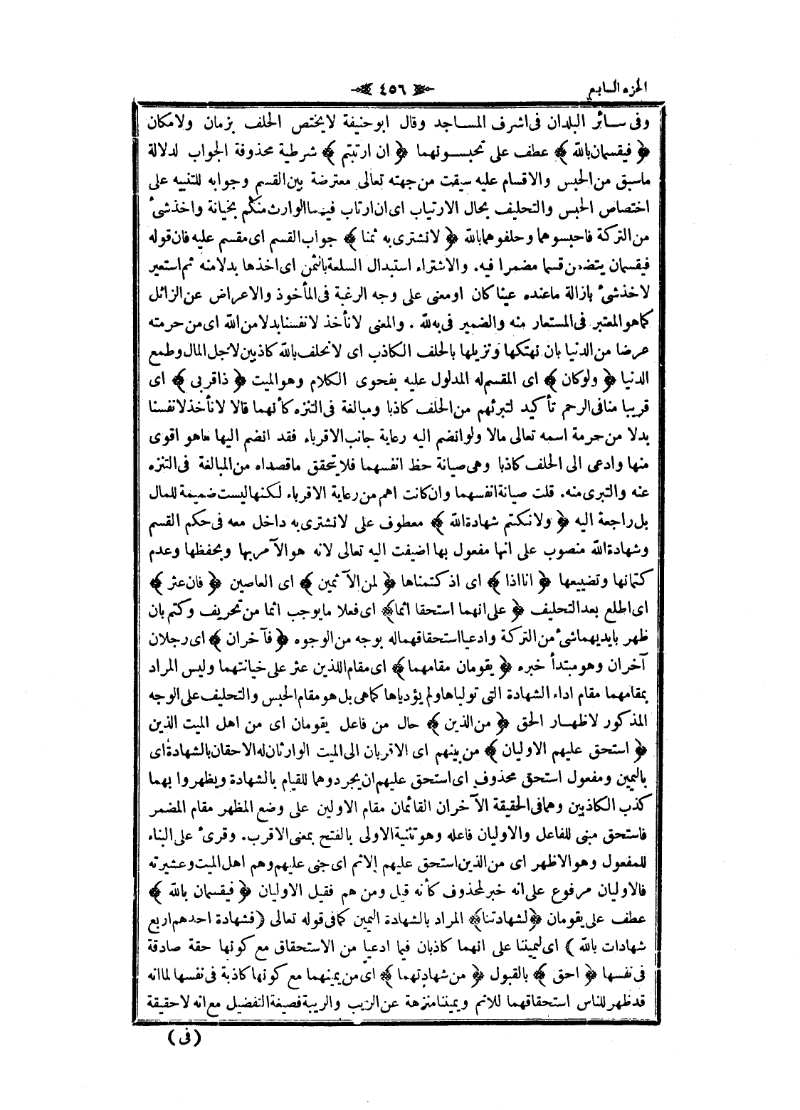 وفى سائر البلدان فى اشرف المساجد وقال ابو حنيفة لا يختص الحلف بزمان ولا مكان فَيُقْسِمانِ بِاللَّهِ عطف على تحبسونهما إِنِ ارْتَبْتُمْ شرطية محذوفة الجواب لدلالة ما سبق من الحبس والاقسام عليه سيقت من جهته تعالى معترضة بين القسم وجوابه للتنبيه على اختصاص الحبس والتحليف بحال الارتياب اى ان ارتاب فيهما الوارث منكم بخيانة وأخذ شىء من التركة فاحبسوهما وحلفوهما بالله لا نَشْتَرِي بِهِ ثَمَناً جواب القسم اى مقسم عليه فان قوله فيقسمان يتضمن قسما مضمرا فيه. والاشتراء استبدال السلعة بالثمن اى أخذها بدلا منه ثم استعير لاخذ شىء بازالة ما عنده عينا كان او معنى على وجه الرغبة فى المأخوذ والاعراض عن الزائل كما هو المعتبر فى المستعار منه والضمير فى به لله. والمعنى لا نأخذ لانفسنا بدلا من الله اى من حرمته عرضا من الدنيا بان نهتكها ونزيلها بالحلف الكاذب اى لا نحلف بالله كاذبين لاجل المال وطمع الدنيا وَلَوْ كانَ اى المقسم له المدلول عليه بفحوى الكلام وهو الميت ذا قُرْبى اى قريبا منافى الرحم تأكيد لتبرئهم من الحلف كاذبا ومبالغة فى التنزه كأنهما قالا لا نأخذ لا نفسنا بدلا من حرمة اسمه تعالى مالا ولو انضم اليه رعاية جانب الأقرباء فقد انضم إليها ما هو أقوى منها وادعى الى الحلف كاذبا وهى صيانة حظ أنفسهما فلا يتحقق ما قصداه من المبالغة فى التنزه عنه والتبري منه. قلت صيانة أنفسهما وان كانت أهم من رعاية الأقرباء لكنها ليست ضميمة للمال بل راجعة اليه وَلا نَكْتُمُ شَهادَةَ اللَّهِ معطوف على لا نشترى به داخل معه فى حكم القسم وشهادة الله منصوب على انها مفعول بها أضيفت اليه تعالى لانه هو الآمر بها وبحفظها وعدم كتمانها وتضييعها إِنَّا إِذاً اى إذ كتمناها لَمِنَ الْآثِمِينَ اى العاصين فَإِنْ عُثِرَ اى اطلع بعد التحليف عَلى أَنَّهُمَا اسْتَحَقَّا إِثْماً اى فعلا ما يوجب اثما من تحريف وكتم بان ظهر بايديهما شىء من التركة وادعيا استحقاقهما له بوجه من الوجوه فَآخَرانِ اى رجلان آخران وهو مبتدأ خبره يَقُومانِ مَقامَهُما اى مقام اللذين عثر على خيانتهما وليس المراد بمقامهما مقام أداء الشهادة التي تولياها ولم يؤدياها كما هى بل هو مقام الحبس والتحليف على الوجه المذكور لاظهار الحق مِنَ الَّذِينَ حال من فاعل يقومان اى من اهل الميت الذين اسْتَحَقَّ عَلَيْهِمُ الْأَوْلَيانِ من بينهم اى الاقربان الى الميت الوارثان له الاحقان بالشهادة اى باليمين ومفعول استحق محذوف اى استحق عليهم ان يجردوهما للقيام بالشهادة ويظهروا بهما كذب الكاذبين وهما فى الحقيقة الآخران القائمان مقام الأولين على وضع المظهر مقام المضمر فاستحق مبنى للفاعل والاوليان فاعله وهو تثنية الاولى بالفتح بمعنى الأقرب. وقرىء على البناء للمفعول وهو الأظهر اى من الذين استحق عليهم الإثم اى جنى عليهم وهم اهل الميت وعشيرته فالاوليان مرفوع على انه خبر لمحذوف كأنه قيل ومن هم فقيل الاوليان فَيُقْسِمانِ بِاللَّهِ عطف على يقومان لَشَهادَتُنا المراد بالشهادة اليمين كما فى قوله تعالى فَشَهادَةُ أَحَدِهِمْ أَرْبَعُ شَهاداتٍ بِاللَّهِ اى ليميننا على انهما كاذبان فيما ادعيا من الاستحقاق مع كونها حقة صادقة فى نفسها أَحَقُّ بالقبول مِنْ شَهادَتِهِما اى من يمينهما مع كونها كاذبة فى نفسها لما انه قد ظهر للناس استحقاقهما للاثم ويميننا منزهة عن الريب والريبة فصيغة التفضيل مع انه لا حقيقة