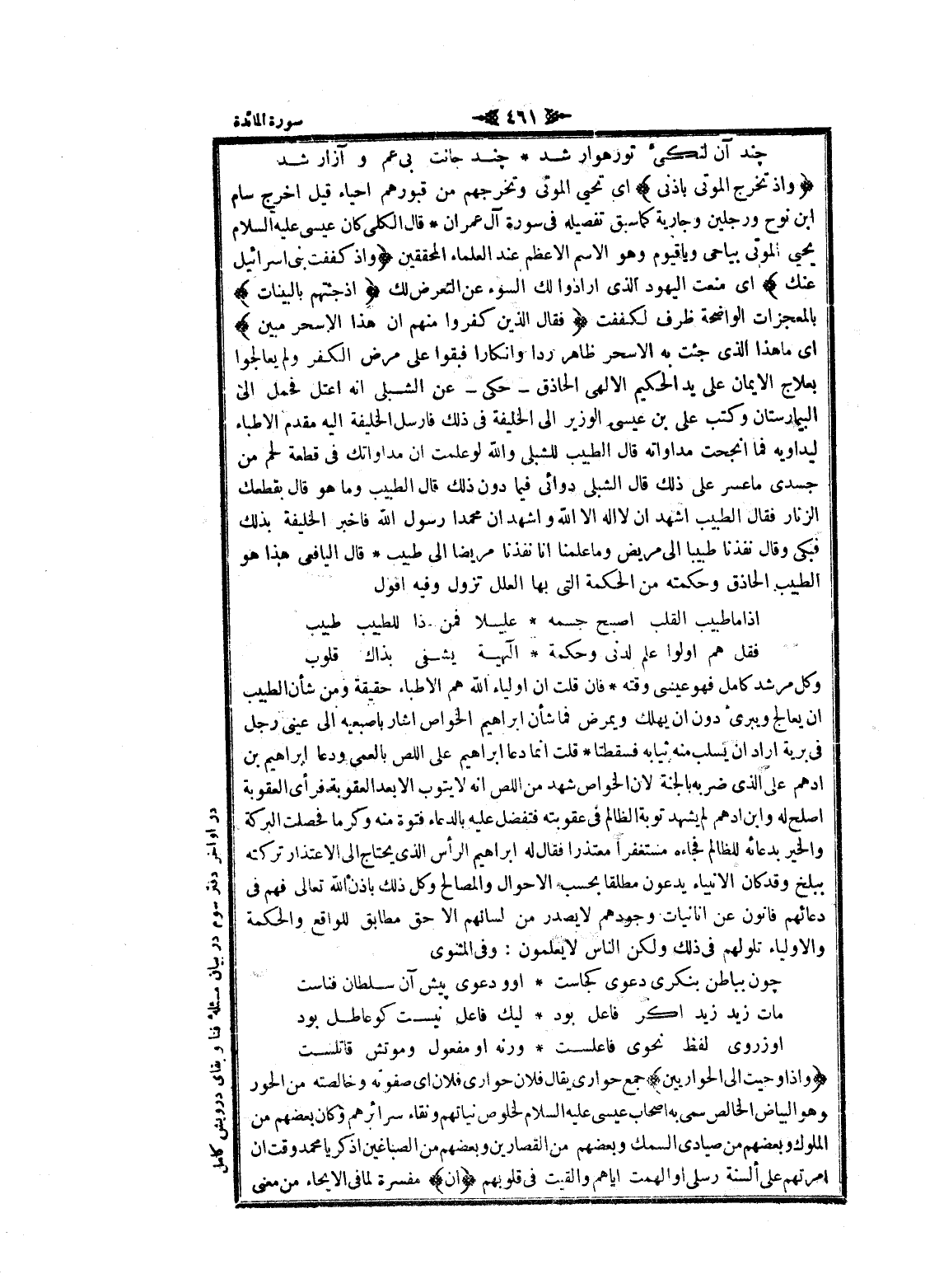 وكل مرشد كامل فهو عيسى وقته فان قلت ان اولياء الله هم الأطباء حقيقة ومن شأن الطبيب ان يعالج ويبرئ دون ان يهلك ويمرض فما شأن ابراهيم الخواص أشار بإصبعيه الى عينى رجل فى برية أراد ان يسلب منه ثيابه فسقطتا. قلت انما دعا ابراهيم على اللص بالعمى ودعا ابراهيم بن أدهم على الذي ضربه بالجنة لان الخواص شهد من اللص انه لا يتوب الا بعد العقوبة فرأى العقوبة أصلح له وابن أدهم لم يشهد توبة الظالم فى عقوبته فتفضل عليه بالدعاء فتوة منه وكرما فحصلت البركة والخير بدعائه للظالم فجاءه مستغفرا معتذرا فقال له ابراهيم الرأس الذي يحتاج الى الاعتذار تركته ببلخ وقد كان الأنبياء يدعون مطلقا بحسب الأحوال والمصالح وكل ذلك بإذن الله تعالى فهم فى دعائهم فانون عن انانيات وجودهم لا يصدر من لسانهم الا حق مطابق للواقع والحكمة والأولياء تلولهم فى ذلك ولكن الناس لا يعلمون: وفى المثنوى