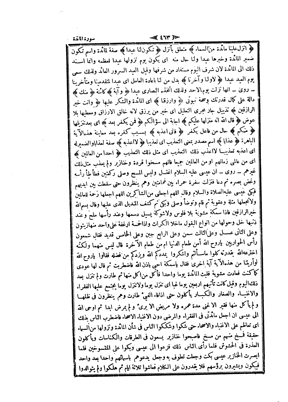 أَنْزِلْ عَلَيْنا مائِدَةً مِنَ السَّماءِ متعلق بأنزل تَكُونُ لَنا عِيداً صفة لمائدة واسم تكون ضمير المائدة وخبرها عيدا ولنا حال منه اى يكون يوم نزولها عيدا فعظمه وانما أسند ذلك الى المائدة لان شرف اليوم مستفاد من شرفها وقيل العيد السرور العائد ولذلك سمى يوم العيد عيدا لِأَوَّلِنا وَآخِرِنا بدل من لنا باعادة العامل اى عيدا لمتقدمينا ومتأخرينا- روى- انها نزلت يوم الأحد ولذلك اتخذه النصارى عيدا وَآيَةً كائنة مِنْكَ دالة على كمال قدرتك وصحة نبوتى وَارْزُقْنا اى المائدة والشكر عليها وَأَنْتَ خَيْرُ الرَّازِقِينَ تذييل جار مجرى التعليل اى خير من يرزق لانه خالق الأرزاق ومعطيها بلا عوض قالَ اللَّهُ إِنِّي مُنَزِّلُها عَلَيْكُمْ اجابة الى سؤالكم فَمَنْ يَكْفُرْ بَعْدُ اى بعد تنزيلها مِنْكُمْ حال من فاعل يكفر فَإِنِّي أُعَذِّبُهُ بسبب كفره بعد معاينة هذه الآية الباهرة عَذاباً اسم مصدر بمعنى التعذيب اى تعذيبا لا أُعَذِّبُهُ صفة لعذابا والضمير له اى أعذبه تعذيبا لا أعذب ذلك التعذيب اى مثل ذلك التعذيب أَحَداً مِنَ الْعالَمِينَ اى من عالمى زمانهم او من العالمين جميعا فانهم مسخوا قردة وخنازير ولم يعذب مثل ذلك غيرهم- روى- ان عيسى عليه السلام اغتسل ولبس المسح وصلى ركعتين فطأطأ رأسه وغض بصره ثم دعا فنزلت سفرة حمراء بين غمامتين وهم ينظرون حتى سقطت بين أيديهم فبكى عيسى عليه الصلاة والسلام وقال اللهم اجعلنى من الشاكرين اللهم اجعلها رحمة للعالمين ولا تجعلها مثلة وعقوبة ثم قام وتوضأ وصلى وبكى ثم كشف المنديل الذي عليها وقال بسم الله خير الرازقين فاذا سمكة مشوية بلا فلوس ولا شوكة يسيل دسمها وعند رأسها ملح وعند ذنبها خل وحولها من انواع البقول ما خلا الكراث وإذا خمسة ارغفة على واحد منها زيتون وعلى الثاني عسل وعلى الثالث سمن وعلى الرابع جبن وعلى الخامس قديد فقال شمعون رأس الحواريين يا روح الله أمن طعام الدنيا أم من طعام الآخرة قال ليس منهما ولكنه اخترعه الله بقدرته كلوا ما سألتم واشكروا يمددكم الله ويزدكم من فضله فقالوا يا روح الله لو أريتنا من هذه الآية آية اخرى فقال يا سمكة احيى بإذن الله فاضطربت ثم قال لها عودى كما كنت فعادت مشوية فلبث المائدة يوما واحدا فأكل من أكل منها ثم طارت ولم تنزل بعد ذلك اليوم وقيل كانت تأتيهم أربعين يوما غبا اى تنزل يوما ولا تنزل يوما يجتمع عليها الفقراء والأغنياء والصغار والكبار يأكلون حتى إذا فاء الفيء طارت وهم ينظرون فى ظلها ولم يأكل منها فقير الا غنى مدة عمره ولا مريض الا برئ ولم يمرض ابدا ثم اوحى الله الى عيسى ان اجعل مائدتى فى الفقراء والمرضى دون الأغنياء الأصحاء فاضطرب الناس بذلك اى تعاظم على الأغنياء والأصحاء حتى شكوا وشككوا الناس فى شأن المائدة ونزولها من السماء حقيقة فمسخ منهم من مسخ فاصبحوا خنازير يسعون فى الطرقات والكناسات ويأكلون العذرة فى الحشوش فلما رأى الناس ذلك فزعوا الى عيسى وبكوا على الممسوخين فلما أبصرت الخنازير عيسى بكت وجعلت تطوف به وجعل يدعوهم بأسمائهم واحدا بعد واحد فيبكون ويشيرون برؤسهم فلا يقدرون على الكلام فعاشوا ثلاثة ايام ثم هلكوا ولم يتوالدوا