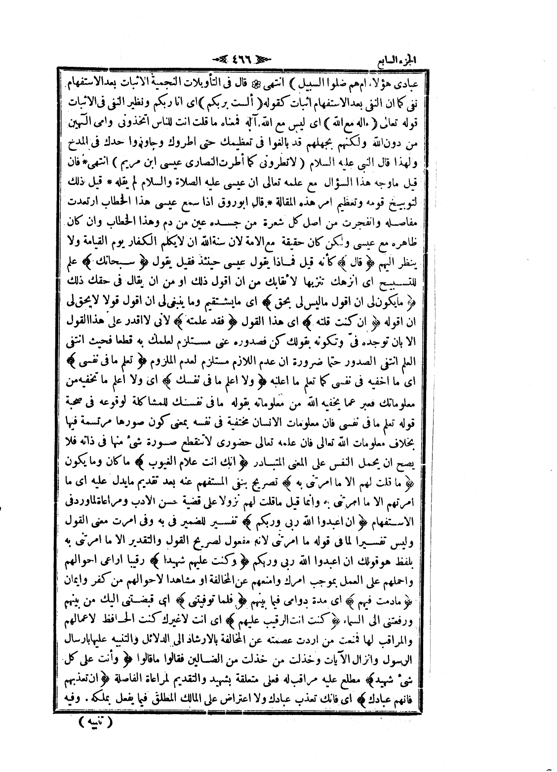عِبادِي هؤُلاءِ أَمْ هُمْ ضَلُّوا السَّبِيلَ انتهى قال فى التأويلات النجمية الإثبات بعد الاستفهام نفى كما ان النفي بعد الاستفهام اثبات كقوله أَلَسْتُ بِرَبِّكُمْ اى انا ربكم ونظير النفي فى الإثبات قوله تعالى أَإِلهٌ مَعَ اللَّهِ اى ليس مع الله آله فمعناه ما قلت أنت للناس اتخذوني وأمي الهين من دون الله ولكنهم بجهلهم قد بالغوا فى تعظيمك حتى اطروك وجاوزوا حدك فى المدح ولهذا قال النبي عليه السلام (لا تطرونى كما أطرت النصارى عيسى ابن مريم) انتهى. فان قيل ما وجه هذا السؤال مع علمه تعالى ان عيسى عليه الصلاة والسلام لم يقله. قيل ذلك لتوبيخ قومه وتعظيم امر هذه المقالة. قال ابو روق إذا سمع عيسى هذا الخطاب ارتعدت مفاصله وانفجرت من اصل كل شعرة من جسده عين من دم وهذا الخطاب وان كان ظاهره مع عيسى ولكن كان حقيقة مع الامة لان سنة الله ان لا يكلم الكفار يوم القيامة ولا ينظر إليهم قالَ كأنه قيل فماذا يقول عيسى حينئذ فقيل يقول سُبْحانَكَ علم للتسبيح اى أنزهك تنزيها لائقابك من ان أقول ذلك او من ان يقال فى حقك ذلك ما يَكُونُ لِي أَنْ أَقُولَ ما لَيْسَ لِي بِحَقٍّ اى ما يستقيم وما ينبغى لى ان أقول قولا لا يحق لى ان أقوله إِنْ كُنْتُ قُلْتُهُ اى هذا القول فَقَدْ عَلِمْتَهُ لانى لا اقدر على هذا القول الا بان توجده فىّ وتكونه بقولك كن فصدوره عنى مستلزم لعلمك به قطعا فحيث انتفى العلم انتفى الصدور حتما ضرورة ان عدم اللازم مستلزم لعدم الملزوم تَعْلَمُ ما فِي نَفْسِي اى ما اخفيه فى نفسى كما تعلم ما اعلنه وَلا أَعْلَمُ ما فِي نَفْسِكَ اى ولا اعلم ما تخفيه من معلوماتك فعبر عما يخفيه الله من معلوماته بقوله ما فى نفسك للمشاكلة لوقوعه فى صحبة قوله تعلم ما فى نفسى فان معلومات الإنسان مختفية فى نفسه بمعنى كون صورها مرتسمة فيها بخلاف معلومات الله تعالى فان علمه تعالى حضورى لا تنقطع صورة شىء منها فى ذاته فلا يصح ان يحمل النفس على المعنى المتبادر إِنَّكَ أَنْتَ عَلَّامُ الْغُيُوبِ ما كان وما يكون ما قُلْتُ لَهُمْ إِلَّا ما أَمَرْتَنِي بِهِ تصريح بنفي المستفهم عنه بعد تقديم ما يدل عليه اى ما امرتهم الا ما أمرتني به وانما قيل ما قلت لهم نزولا على قضية حسن الأدب ومراعاة لما ورد فى الاستفهام أَنِ اعْبُدُوا اللَّهَ رَبِّي وَرَبَّكُمْ تفسير للضمير فى به وفى أمرت معنى القول وليس تفسيرا لما فى قوله ما أمرتني لانه مفعول لصريح القول والتقدير الا ما أمرتني به بلفظ هو قولك ان اعبدوا الله ربى وربكم وَكُنْتُ عَلَيْهِمْ شَهِيداً رقيبا اراعى أحوالهم واحملهم على العمل بموجب أمرك وامنعهم عن المخالفة او مشاهدا لاحوالهم من كفر وايمان ما دُمْتُ فِيهِمْ اى مدة دوامى فيما بينهم فَلَمَّا تَوَفَّيْتَنِي اى قبضتنى إليك من بينهم ورفعتنى الى السماء كُنْتَ أَنْتَ الرَّقِيبَ عَلَيْهِمْ اى أنت لا غيرك كنت الحافظ لاعمالهم والمراقب لها فمنعت من أردت عصمته عن المخالفة بالإرشاد الى الدلائل والتنبيه عليها بإرسال الرسول وإنزال الآيات وخذلت من خذلت من الضالين فقالوا ما قالوا وَأَنْتَ عَلى كُلِّ شَيْءٍ شَهِيدٌ مطلع عليه مراقب له فعلى متعلقة بشهيد والتقديم لمراعاة الفاصلة إِنْ تُعَذِّبْهُمْ فَإِنَّهُمْ عِبادُكَ اى فانك تعذب عبادك ولا اعتراض على المالك المطلق فيما يفعل بملكه. وفيه