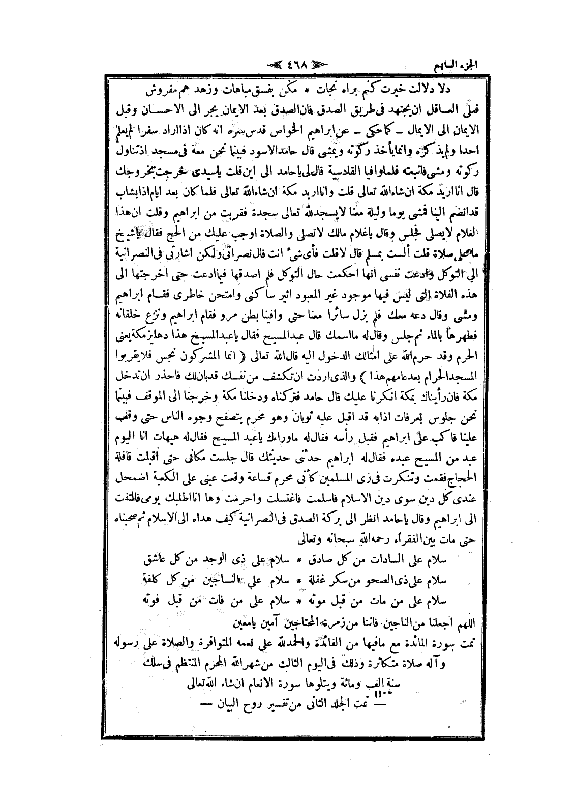 اللهم اجعلنا من الناجين فاننا من زمرة المحتاجين آمين يا معين تمت سورة المائدة مع ما فيها من الفائدة والحمد لله على نعمه المتوافرة والصلاة على رسوله وآله صلاة متكاثرة وذلك فى اليوم الثالث من شهر الله المحرم المنتظم فى سلك سنة الف ومائة ويتلوها سورة الانعام ان شاء الله تعالى- تمت الجلد الثاني من تفسير روح البيان-