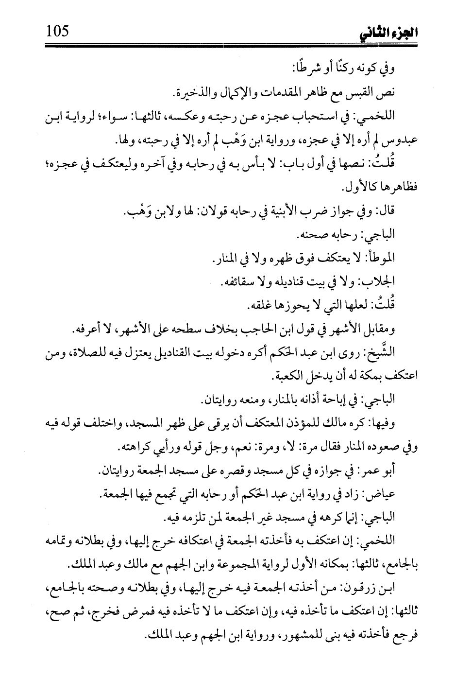 وفيها: كره مالك للمؤذن المعتكف أن يرقى على ظهر المسجد, واختلف قوله فيه وفي صعوده المنار فقال مرة: لا, ومرة: نعم, وجل قوله ورأيي كراهته.