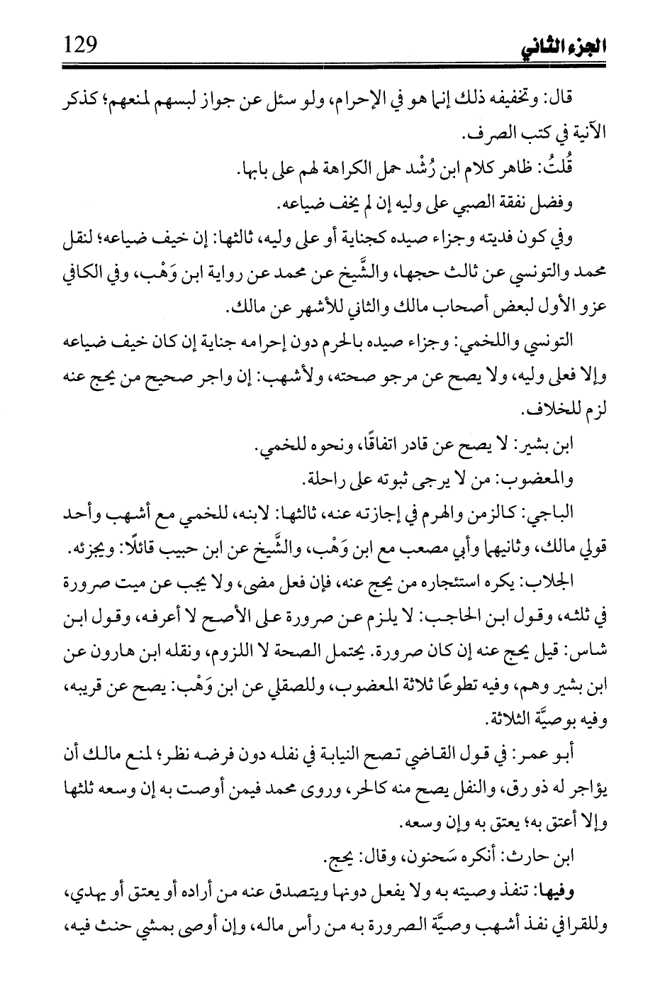 وفي كون فديته وجزاء صيده كجناية أو على وليه, ثالثها: إن خيف ضياعه؛ لنقل محمد والتونسي عن ثالث حجها, والشيخ عن محمد عن رواية ابن وهب, وفي الكافي عزو الأول لبعض أصحاب مالك والثاني للأشهر عن مالك.