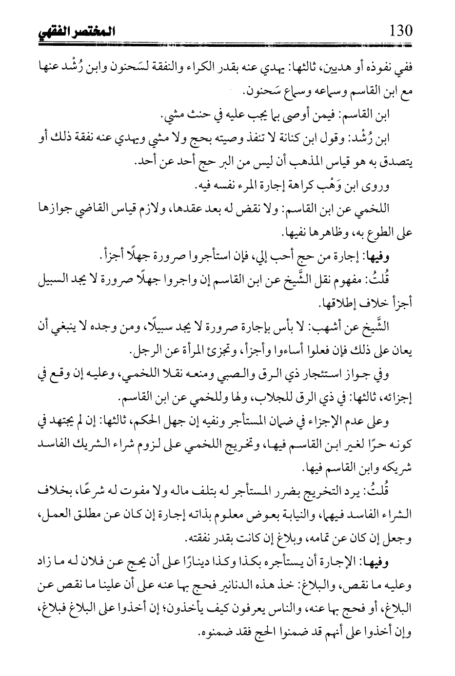 وفيها: الإجارة أن يستأجره بكذا وكذا دينارًا على أن يحج عن فلان له ما زاد وعليه ما نقص, والبلاغ: خذ هذه الدنانير فحج بها عنه على أن علينا ما نقص عن البلاغ, أو فحج بها عنه, والناس يعرفون كيف يأخذون؛ إن أخذوا على البلاغ فبلاغ, وإن أخذوا على أنهم قد ضمنوا الحج فقد ضمنوه.