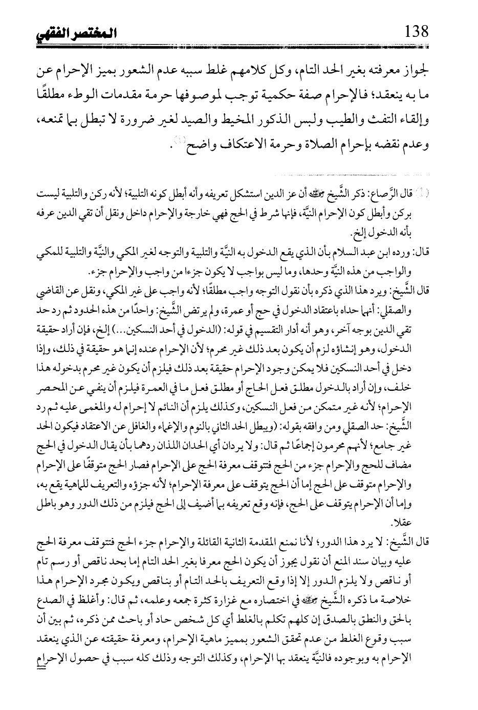 لجواز معرفته بغير الحد التام، وكل كلامهم غلط سببه عدم الشعور بميز الإحرام عن ما به ينعقد؛ فالإحرام صفة حكمية توجب لموصوفها حرمة مقدمات الوطء مطلقًا وإلقاء التفث والطيب ولبس الذكور المخيط والصيد لغير ضرورة لا تبطل بما تمنعه، وعدم نقضه بإحرام الصلاة وحرمة الاعتكاف واضح.