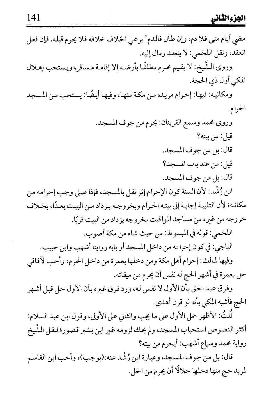 ابن رُشْد: لأن السنة كون الإحرام إثر نفل بالمسجد فإذا صلى وجب إحرامه من مكانه؛ لأن التلبية إجابة إلى بيته الحرام وبخروجه يزداد من البيت بعدًا، بخلاف خروجه من غيره من مساجد المواقيت بخروجه يزداد البيت قربًا.