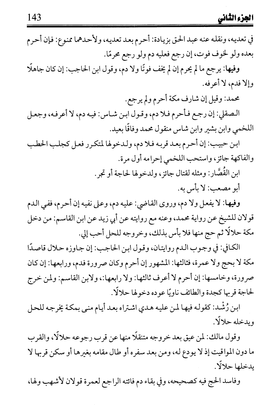 الكافي: في وجوب الدم روايتان، وقول ابن الحاجب: إن جاوزه حلال قاصدًا مكة لا بحج ولا عمرة، فثالثهما: المشهور إن أحرم وكان صرورة فدم، ورابعها: إن كان صرورة، وخامسها: إن أحرم فلا أعرف ثالثهما: ولا رابعها:، ولابن القاسم: ولمن خرج لحاجة قربها كجدة والطائف ناويًا عوده دخولها حلالًا.