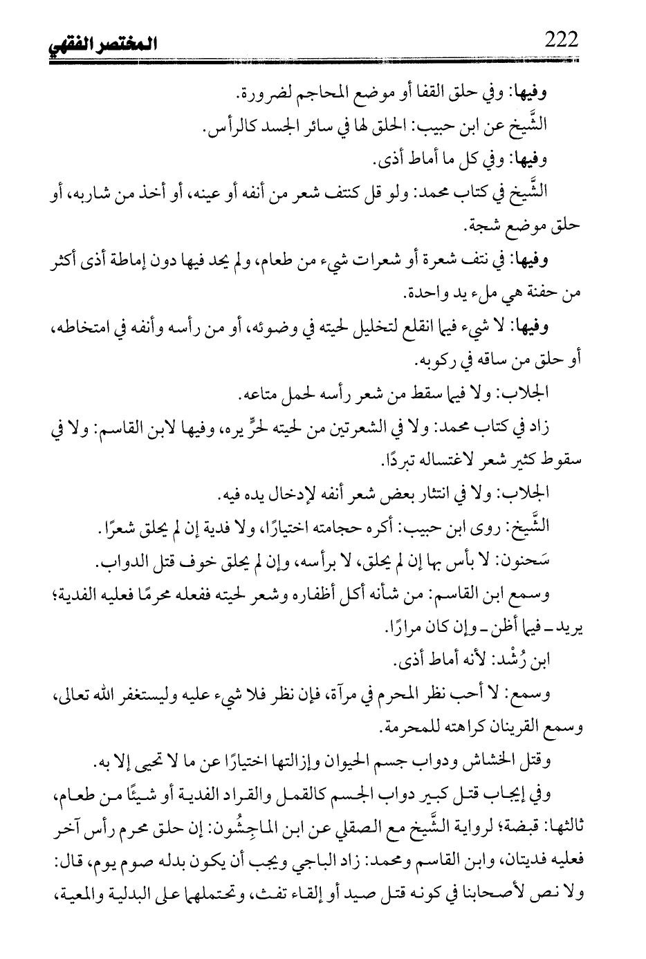 وفيها: لا شيء فيما انقلع لتخليل لحيته في وضوئه, أو من رأسه وأنفه في امتخاطه, أو حلق من ساقه في ركوبه.