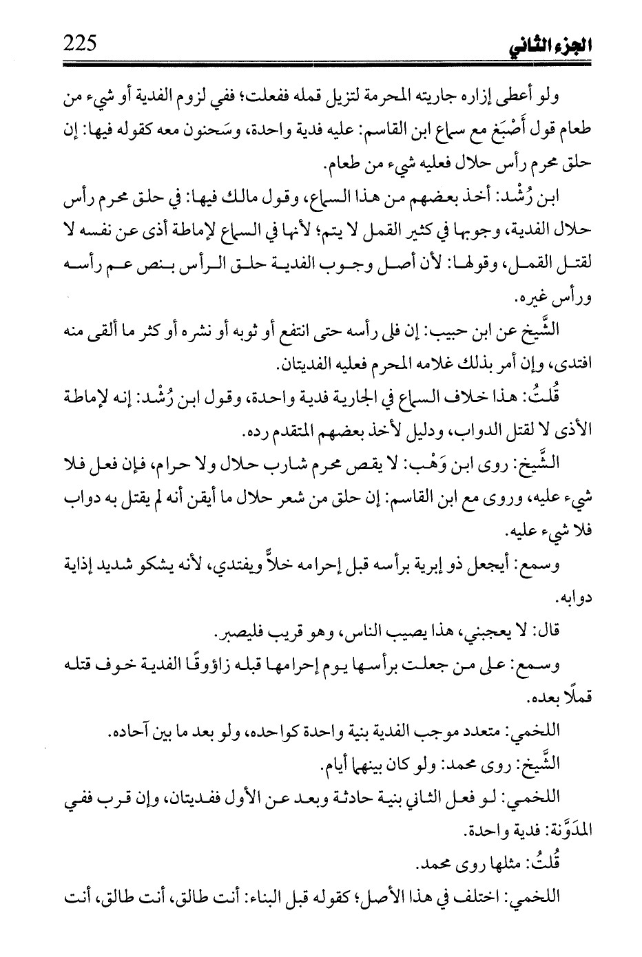 ابن رشد: أخذ بعضهم من هذا السماع, وقول مالك فيها: في حلق محرم رأس حلال الفدية, وجوبها في كثير القمل لا يتم؛ لأنها في السماع لإماطة أذى عن نفسه لا لقتل القمل, وقولها: لأن أصل وجوب الفدية حلق الرأس بنص عم رأسه ورأس غيره.
