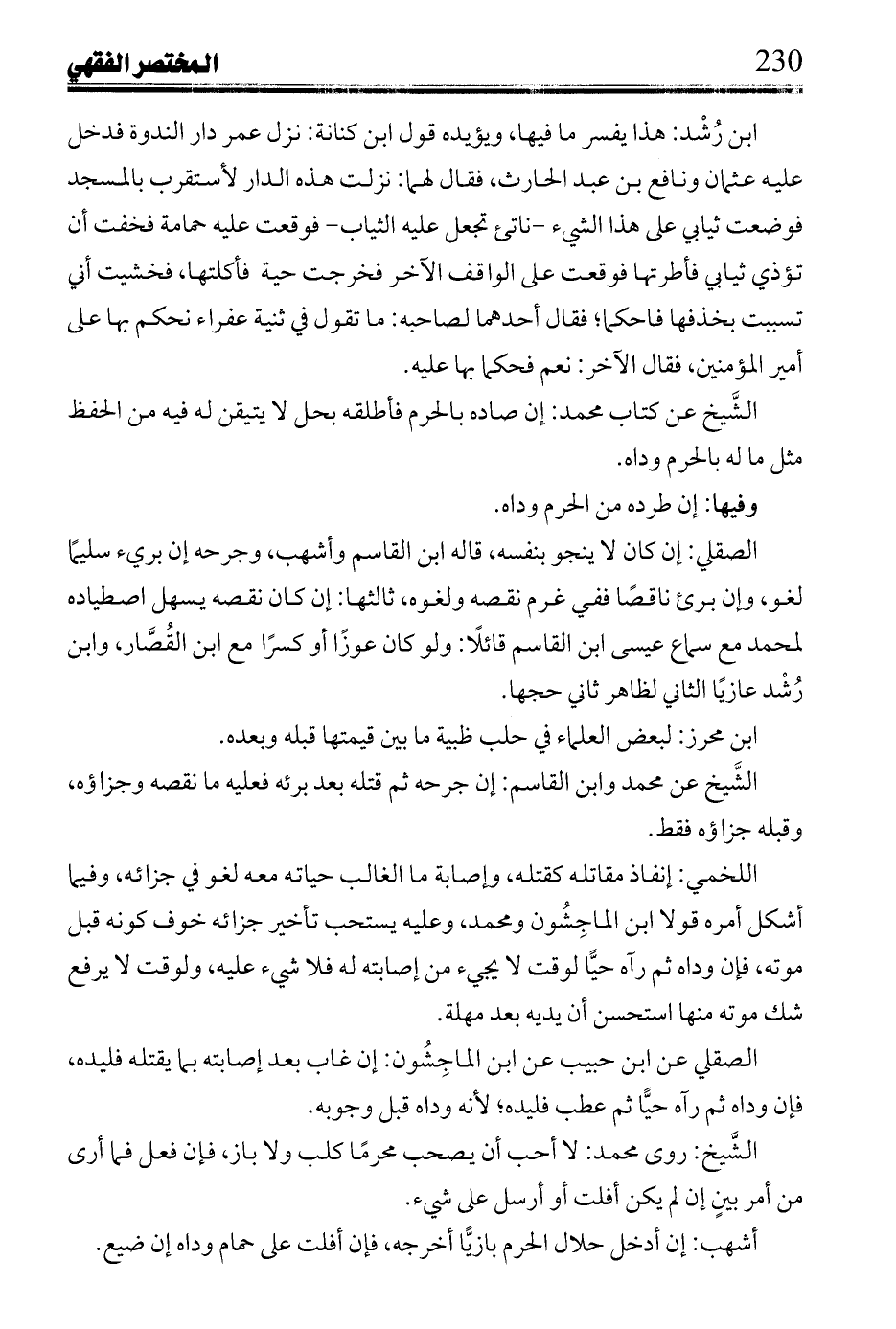 ابن رشد: هذا يفسر ما فيها, ويؤيده قول ابن كنانة: نزل عمر دار الندوة فدخل عليه عثمان ونافع بن عبد الحارث, فقال لهما: نزلت هذه الدار لأستقرب بالمسجد فوضعت ثيابي على هذا الشيء- ناتئ تجعل عليه الثياب- فوقعت عليه حمامة فخفت أن تؤذي ثيابي فأطرتها فوقعت على الواقف الآخر فخرجت حية فأكلتها, فخشيت أني تسببت بحذفها فاحكما؛ فقال أحدهما لصاحبه: ما تقول في ثنية عفراء نحكم على أمير المؤمنين, فقال الأخر: نعم فحكما بها عليه.