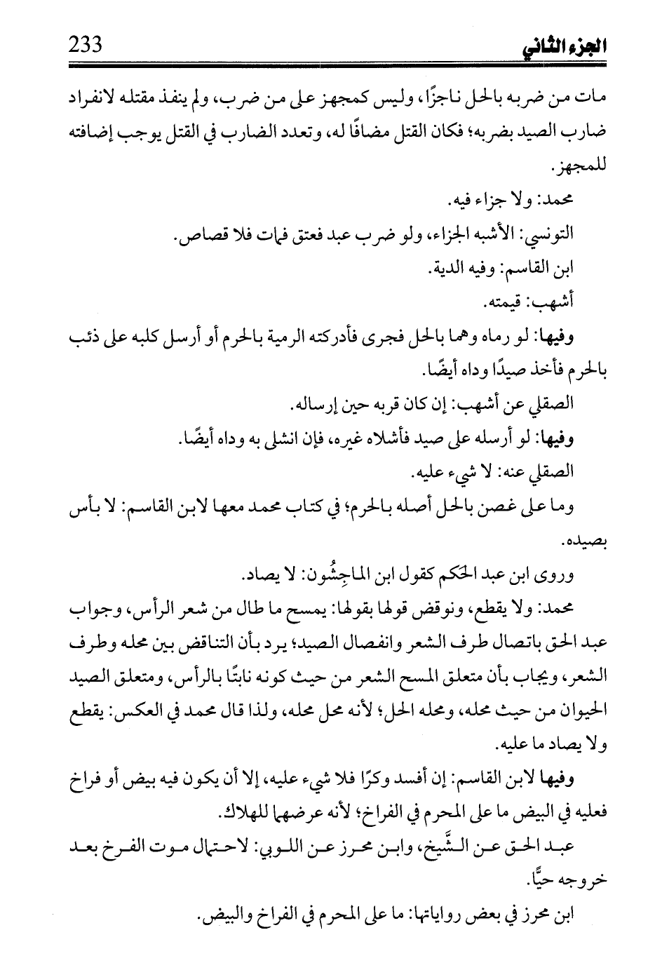محمد: ولا يقطع, ونوقض قولها بقولها: يمسح ما طال من شعر الرأس, وجواب عبد الحق باتصال طرف الشعر, ويجاب بان متعلق المسح الشعر من حيث كونه نابتًا بالرأس, ومتعلق الصيد الحيوان من حيث محله, ومحله الحل؛ لأنه محل محله, ولذا قال محمد في العكس: يقطع ولا يصاد ما عليه.