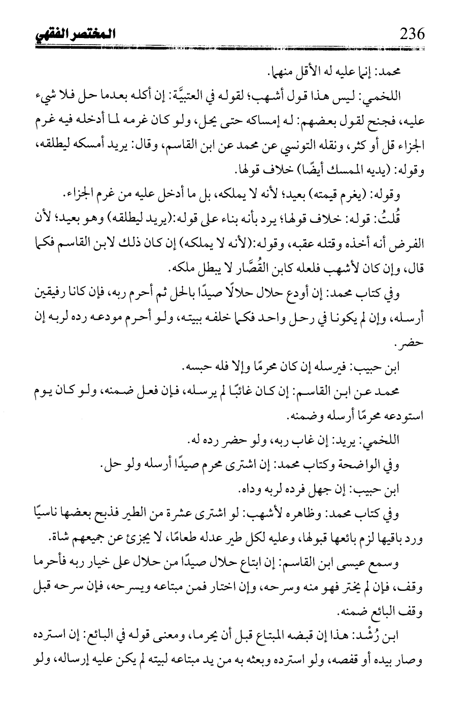 وفي كتاب محمد: وظاهره لأشهب: لو اشترى عشرة من الطير فذبح بعضها ناسيًا ورد باقيها لزم بائعها قبولها، وعليه لكل طير عدله طعامًا، لا يجزئ عن جميعهم شاة.