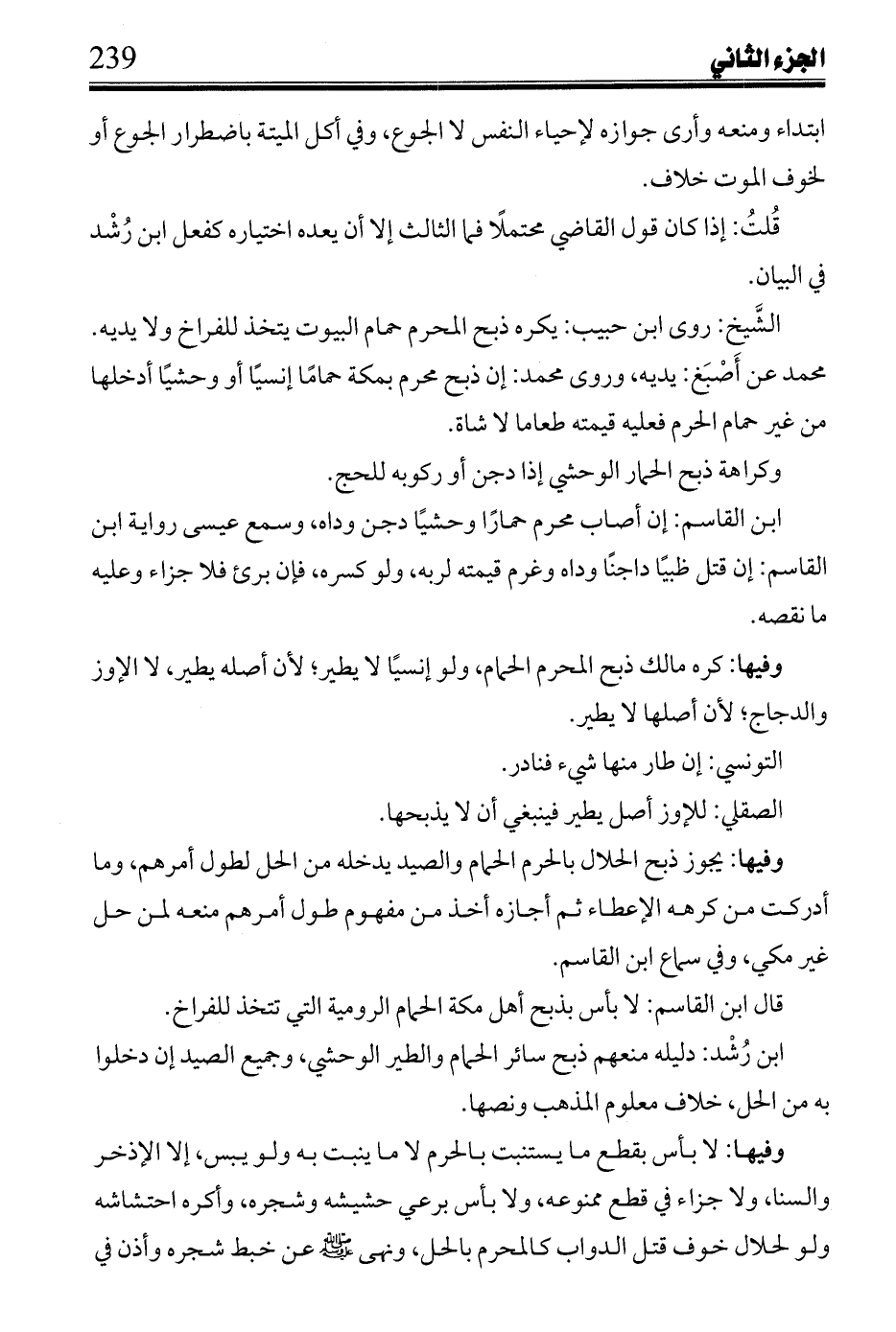 ابن رشد: دليله منعهم ذبح سائر الحمام والطير الوحشي، وجميع الصيد إن دخلوا به من الحل، خلاف معلوم المذهب ونصها.
