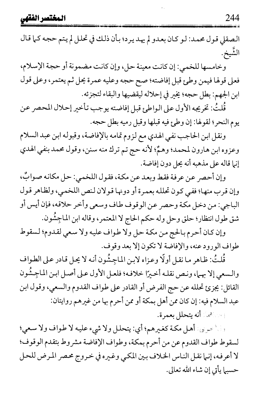 ونقل ابن الحاجب ني الهدي مع لزوم تمامه بالإفاضة، وقبول ابن عبد السلام وعزوه ابن هارون لمحمد؛ وهم؛ لأنه حج تم ترك منه سنن، وقول محمد بنفي الهدي إنما قاله على مذهبه أ، هـ يحل دون إفاضة.