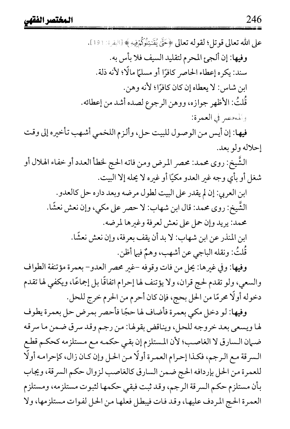 وفيها: لو دخل مكي بعمرة فأضاف لها حجًا فأحصر بمرض حل بعمرة يطوف لها ويسعى بعد خروجه للحل، ويناقض بقولها: من رجم وقد سرق ضمن ما سرقه ضمان السارق لا الغاصب؛ لأن المستلزم إن بقي حكمه مع مستلزمه كحكم قطع السرقة مع الرجم، فكذا إحرام العمرة أولًا من الحل وإن كان زال، كإحرامه أولًا للعمرة من الحل بإرادفه الحج ضمن السارق كالغاصب لزوال حكم السرقة، ويجاب بأن مستلزم حكم السرقة الرجم، وقد ثبت فبقي حكمها لثبوت مستلزمه، ومستلزم العمرة الحج المردف عليها، وقد فات فيبطل فعلها من الحل لفوات مستلزمها، ولا