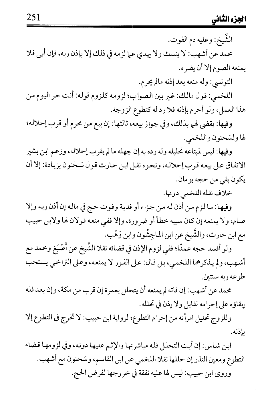 ابن شاس: إن أبت التحلل فله مباشرتها والإثم عليها دونه، وفي لزومها قضاء التطوع ومعين النذر إن حللها نقلا اللخمي عن ابن القاسم، وسحنون مع أشهب.