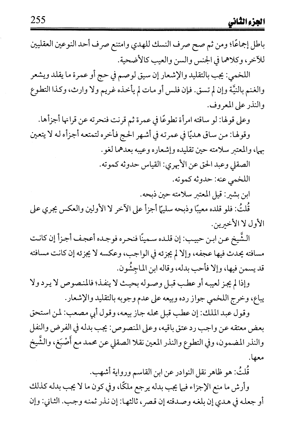 اللخمي: يجب بالتقليد والإشعار إن سيق لو صم في حج أو عمرة ما يقلد ويشعر والغنم بالنية وإن لم تسق. فإن فلس أو مات لم يأخذه غريم ولا وارث، وكذا التطوع والنذر على المعروف.
